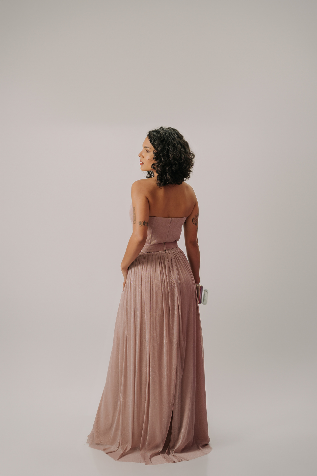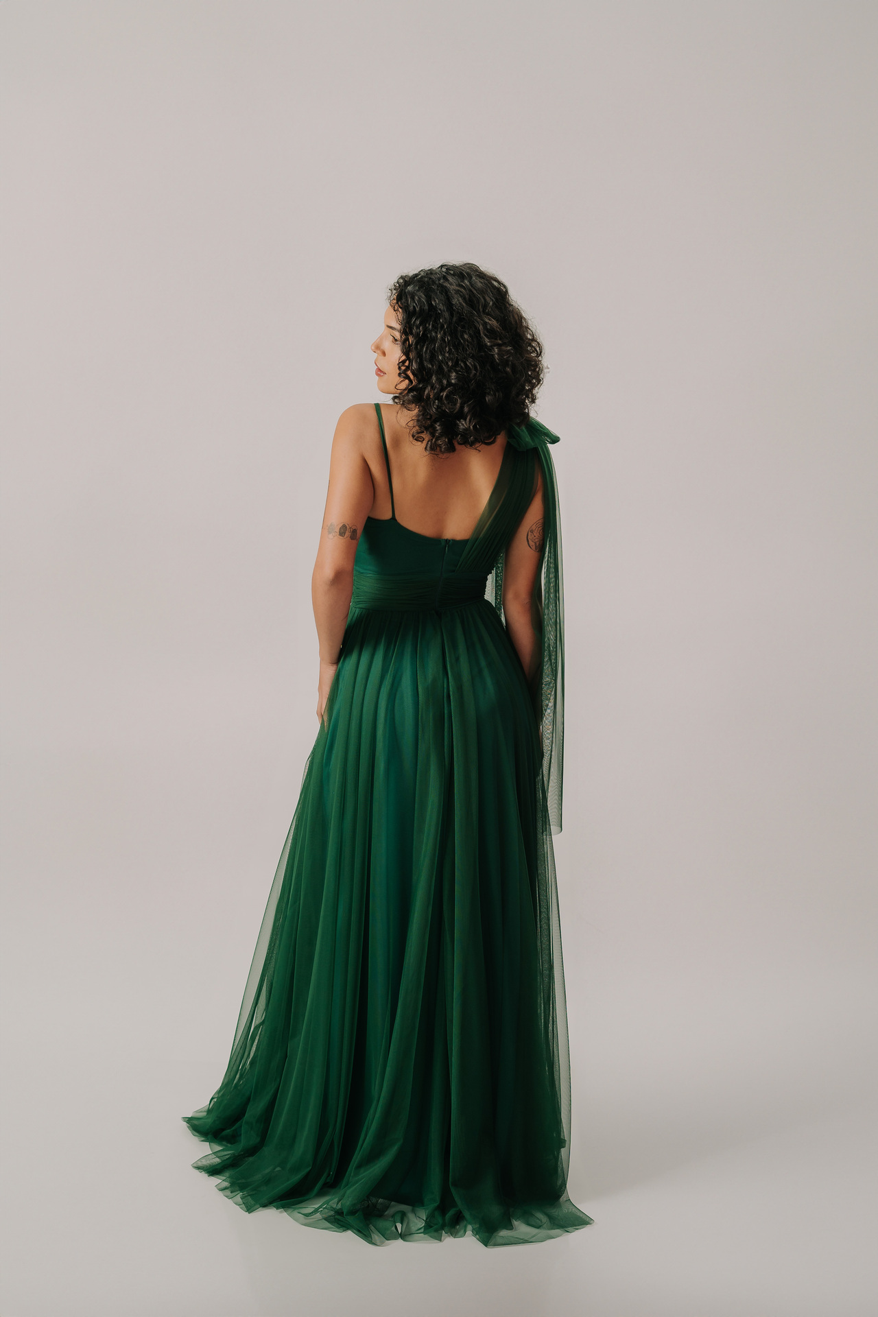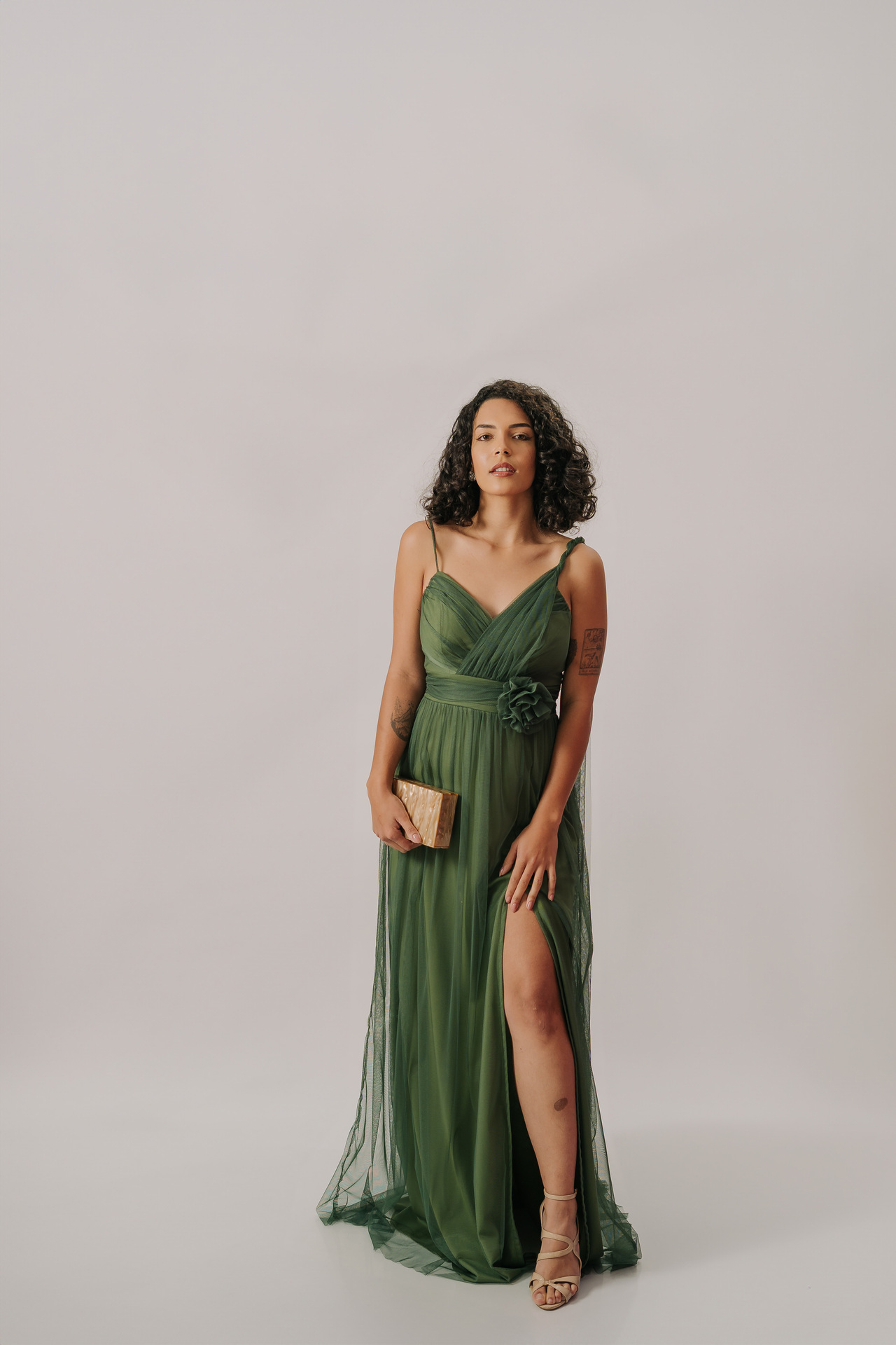 Vestido em tule com detalhe floral e faixa “multiuso” frente e costas