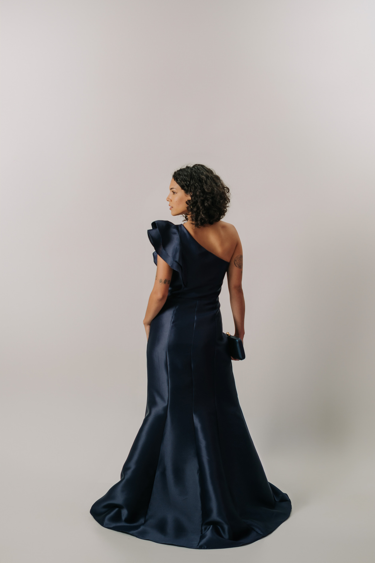 Vestido com decote assimétrico e alça com detalhe em brilho