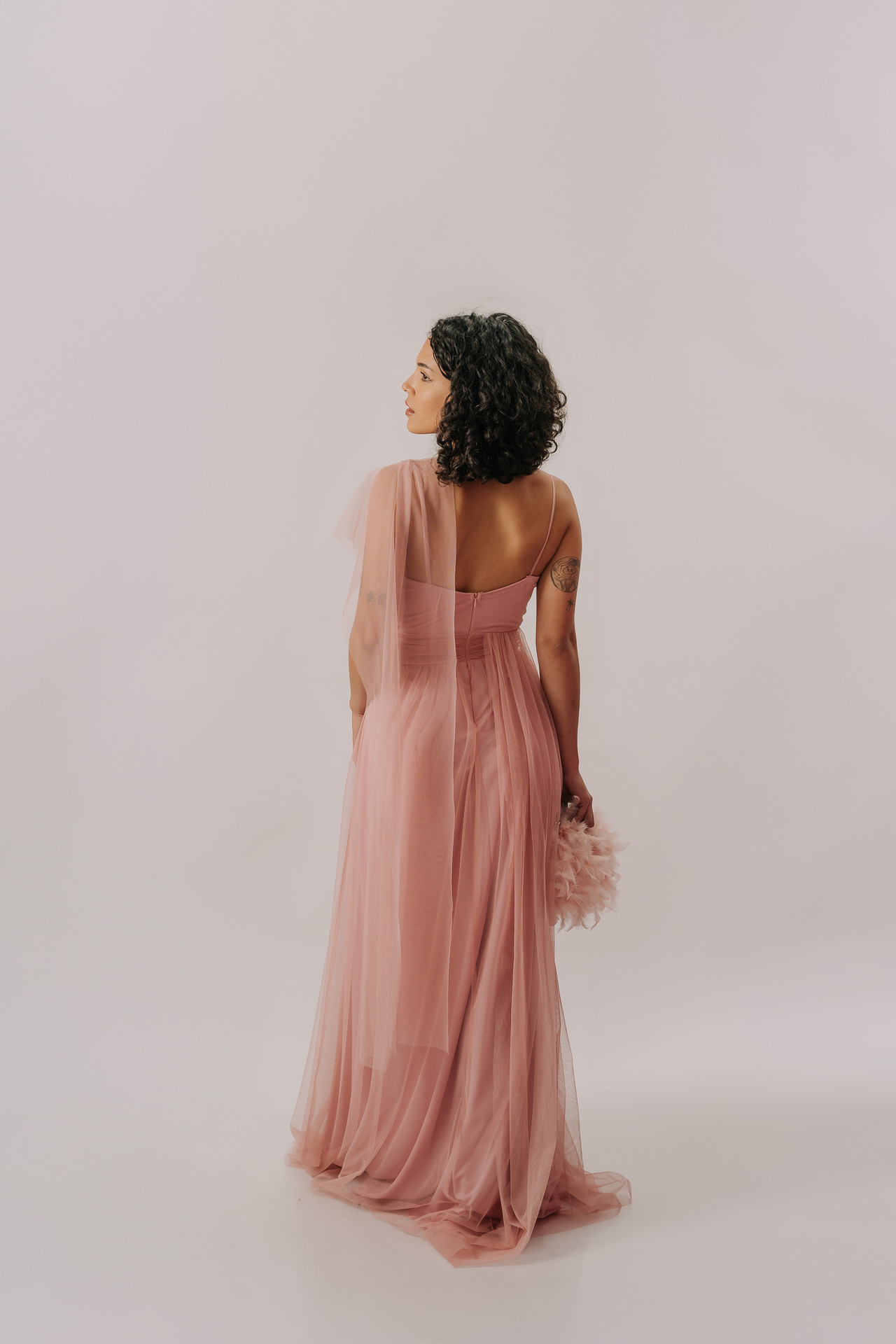 Vestido com decote assimétrico e alça com detalhe em brilho