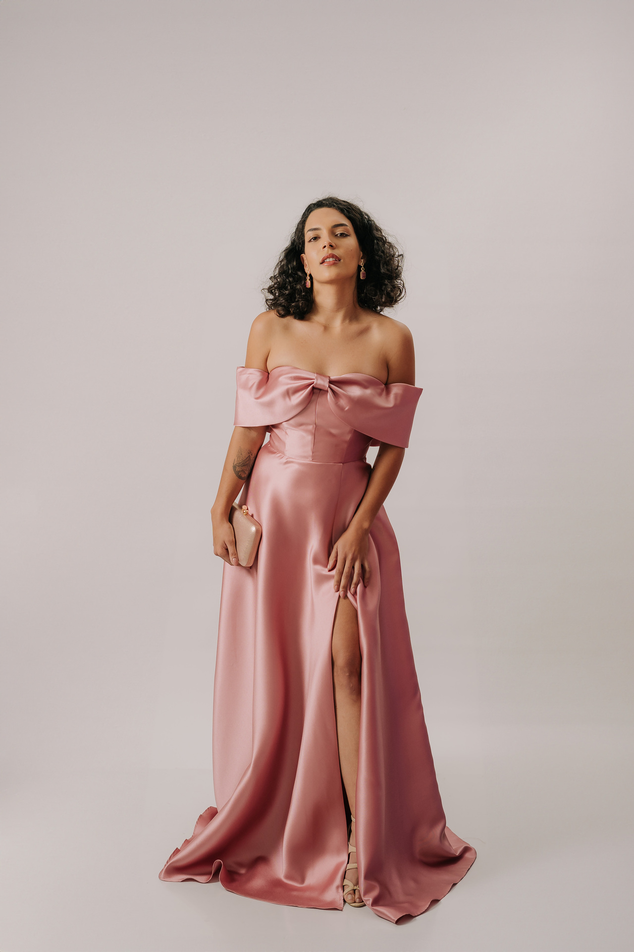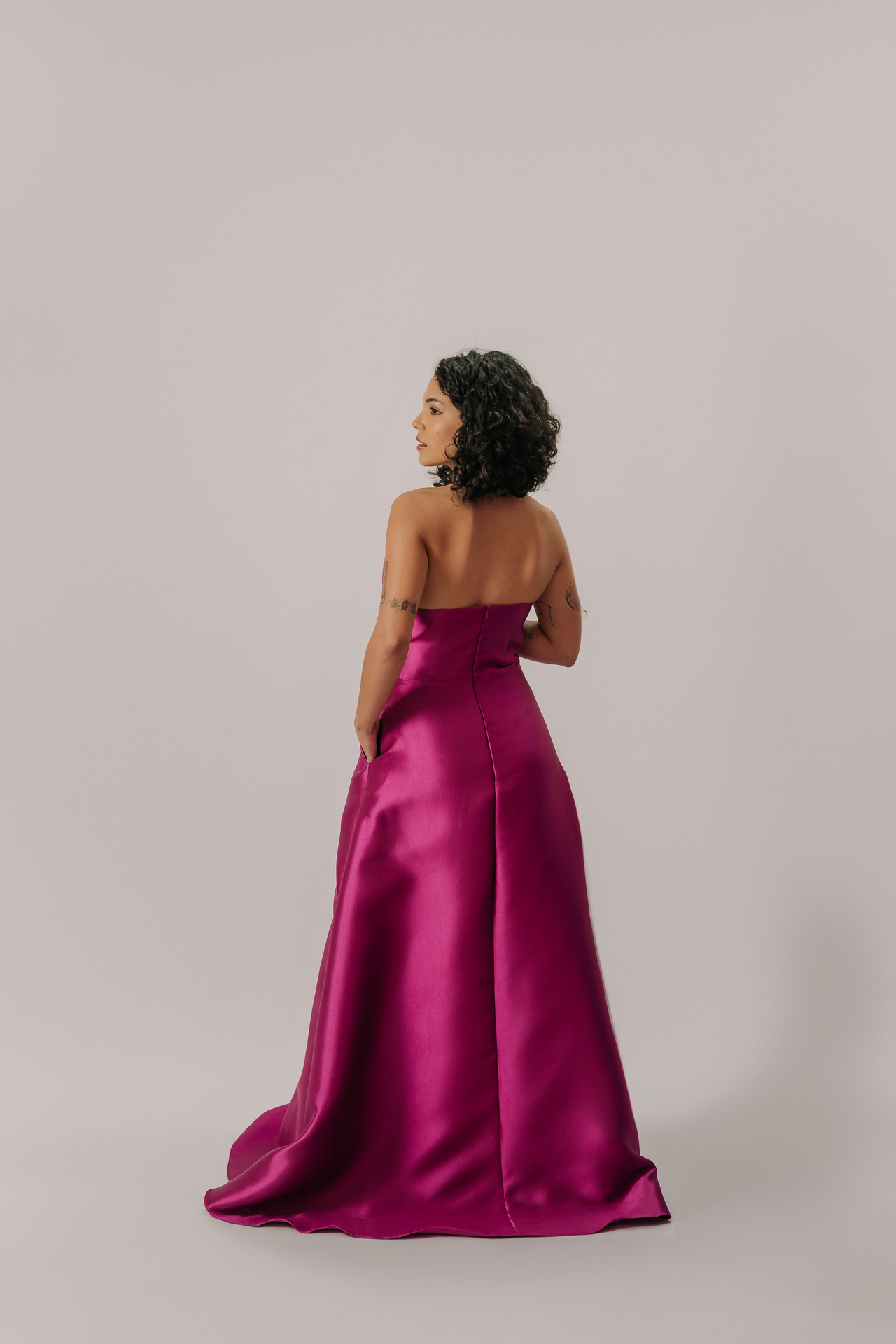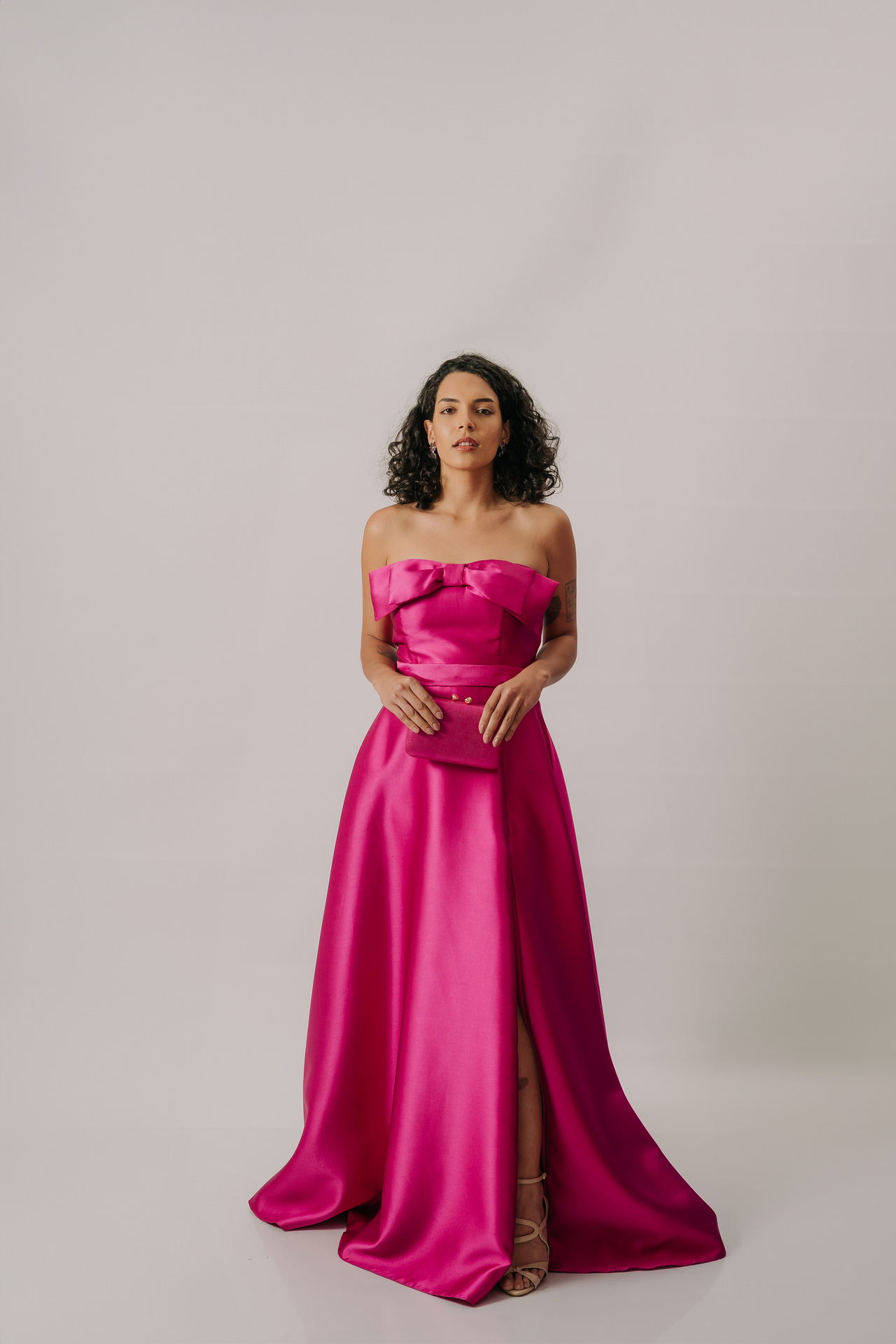 Vestido tomara que caia com laço frontal e saia de fenda (fúcsia)