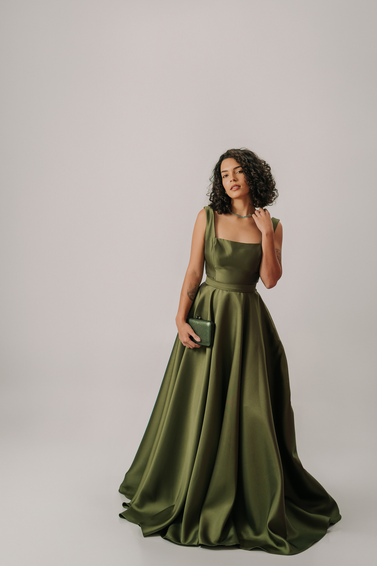 Vestido longo em zibeline, tecido com caimento estruturado e toque acetinado. Decote quadrado de alças largas. O modelo possui faixa avulsa que modela e marca a cintura, valorizando a silhueta. A saia ampla traz um volume marcante e elegante.