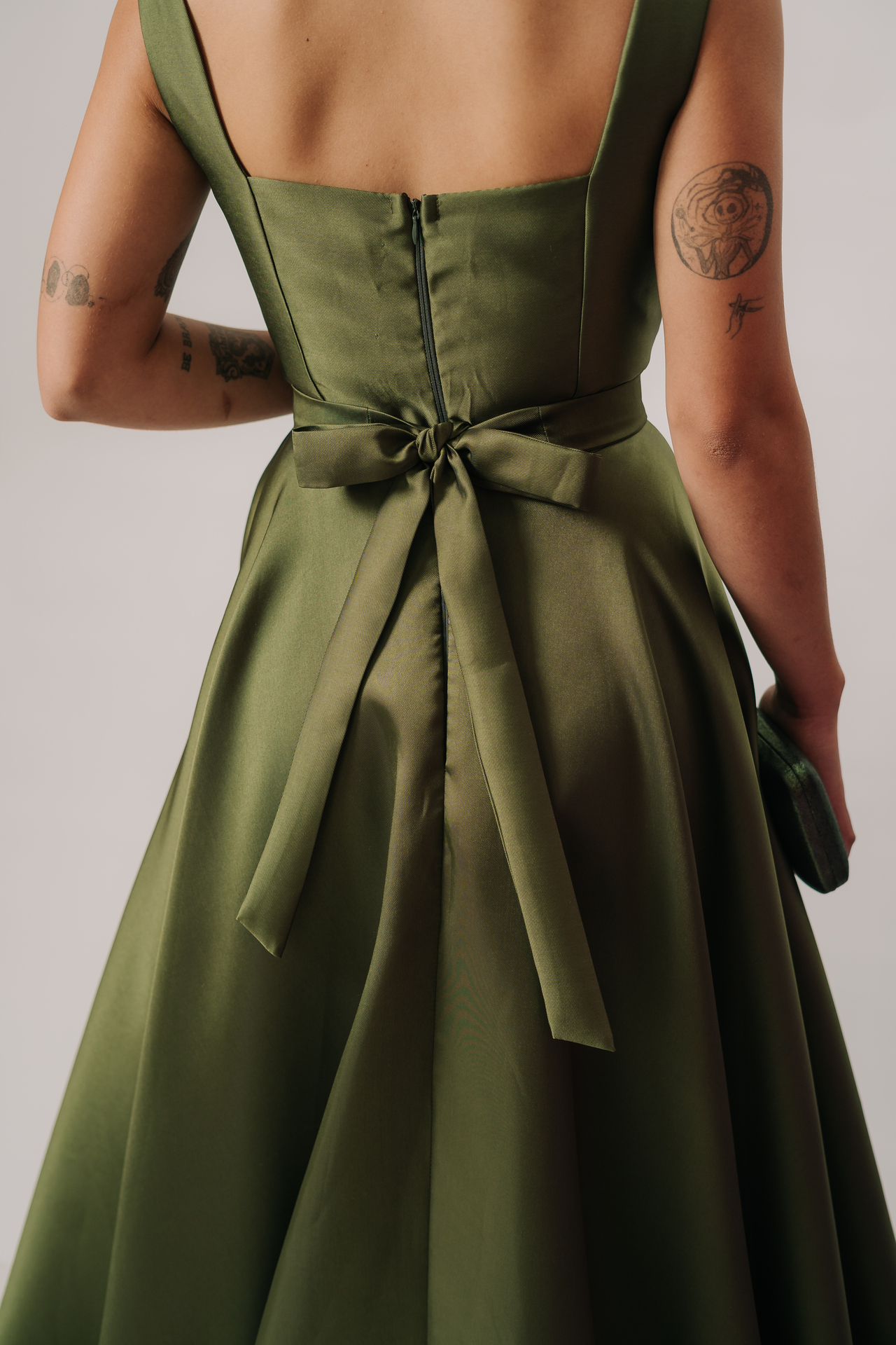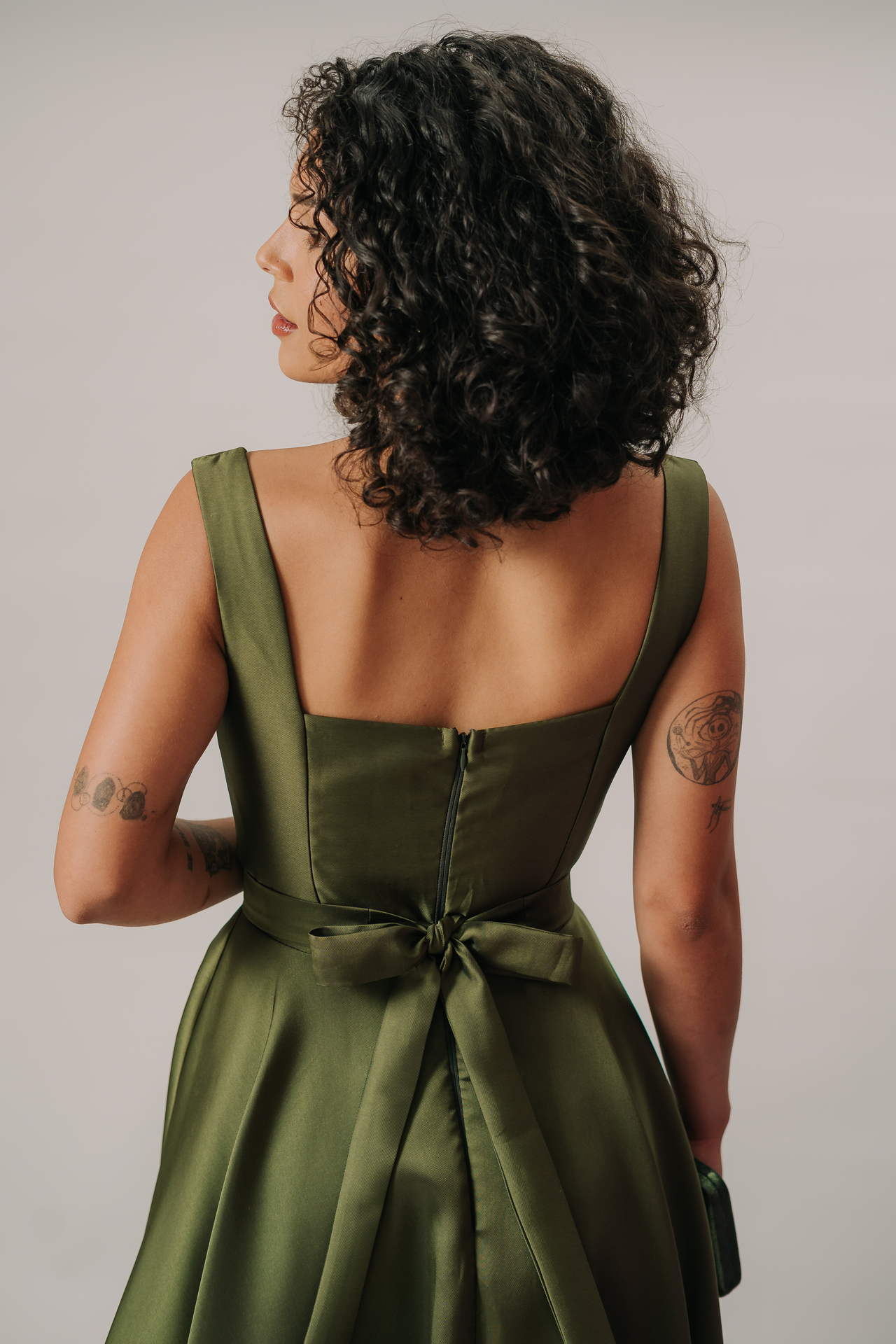 | Modelagem | Ajustada ao corpo na parte superior, Cintura Marcada, Saia ampla efeito "A", Saia rodada |