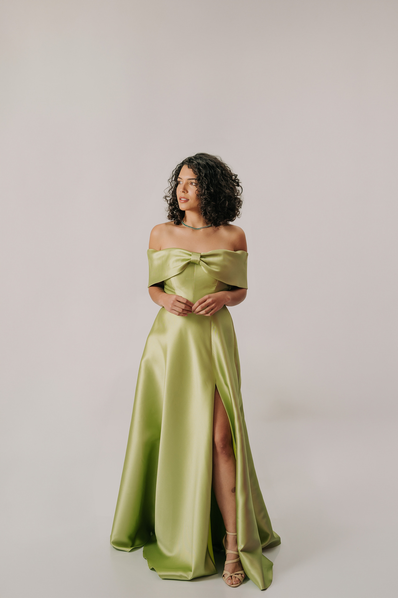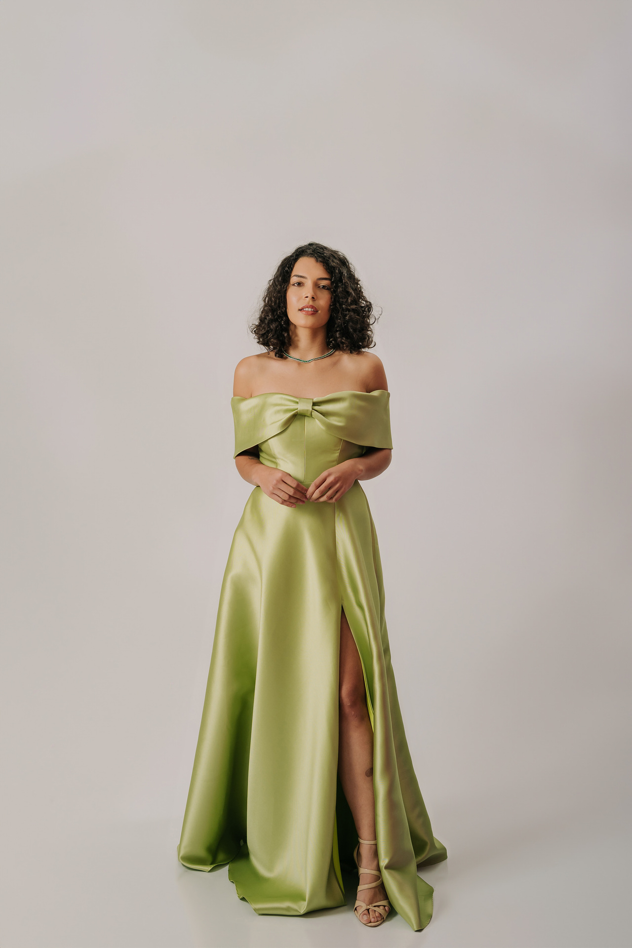 Este sofisticado vestido de gala verde musgo em tecido acetinado estruturado apresenta um elegante decote ombro a ombro com um grande laço no busto e uma fenda alta na saia longa. Ideal para eventos black-tie, sua modelagem valoriza a silhueta, sendo especialmente indicado para biotipos Ampulheta, Retângulo e Triângulo/Pêra, oferecendo glamour e um toque dramático.