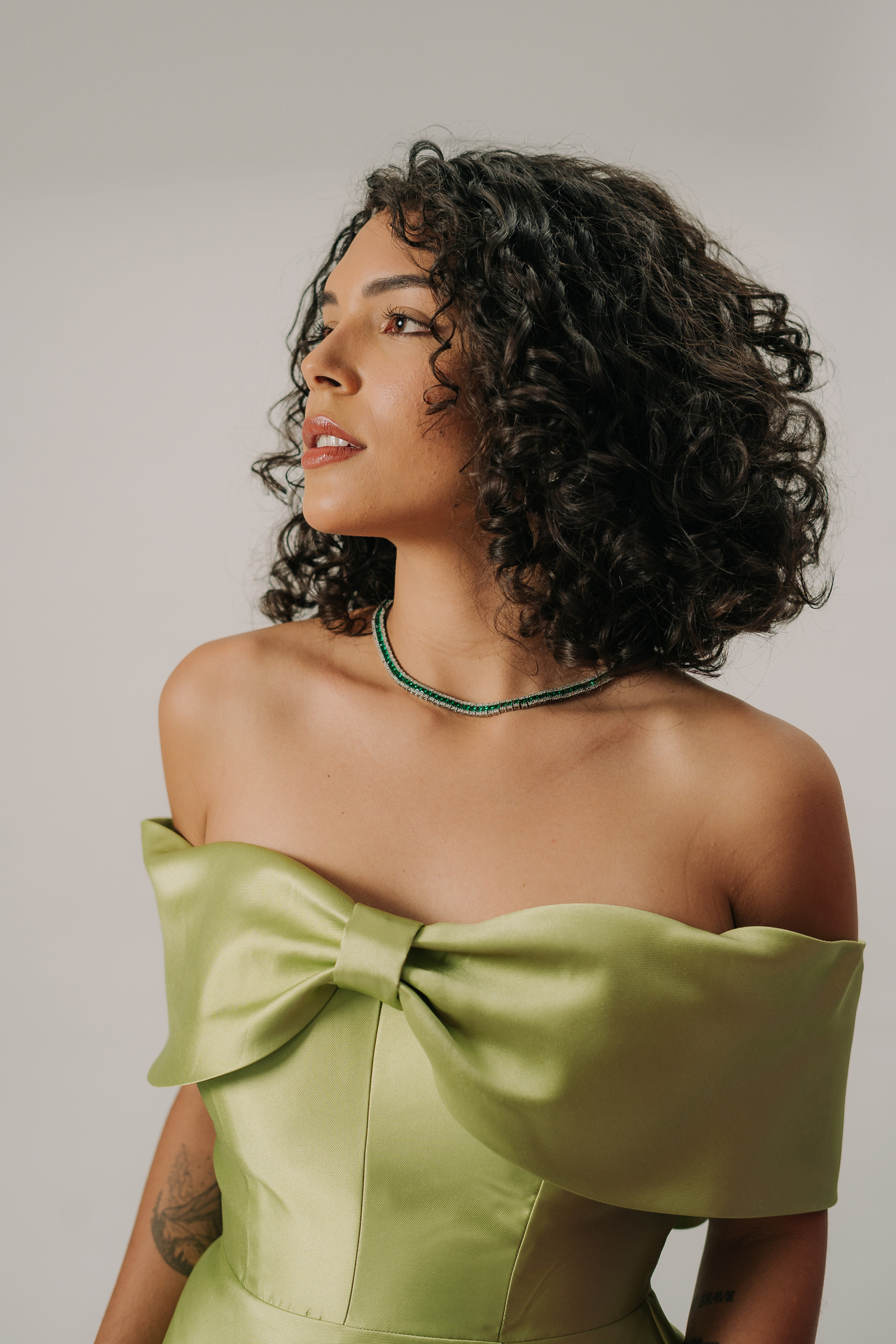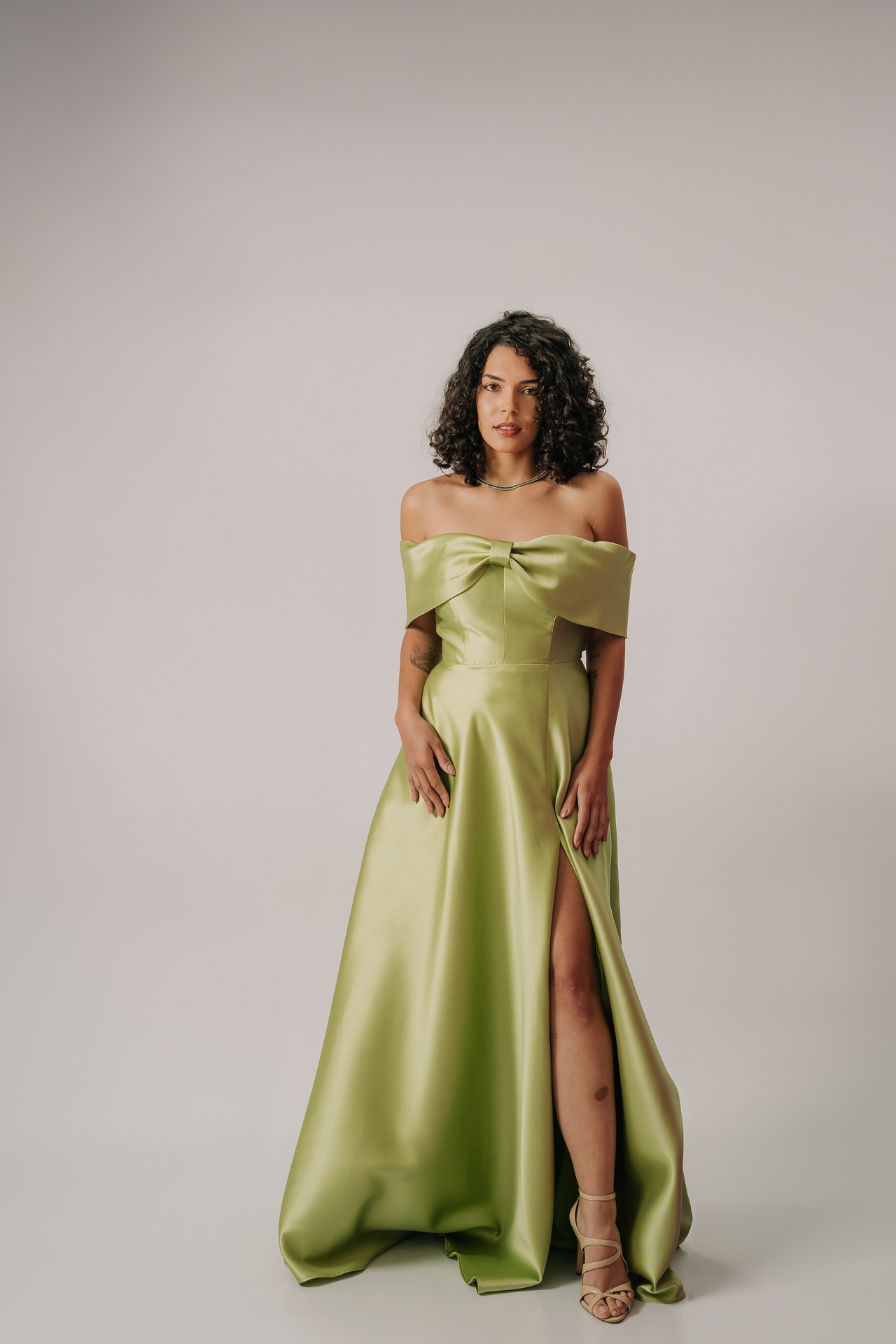 Este vestido exala glamour e sofisticação atemporal, perfeito para uma entrada marcante. Em um tom luxuoso de verde musgo ou verde oliva acetinado, a cor é rica e elegante, com um brilho sutil que reflete a luz de forma requintada.