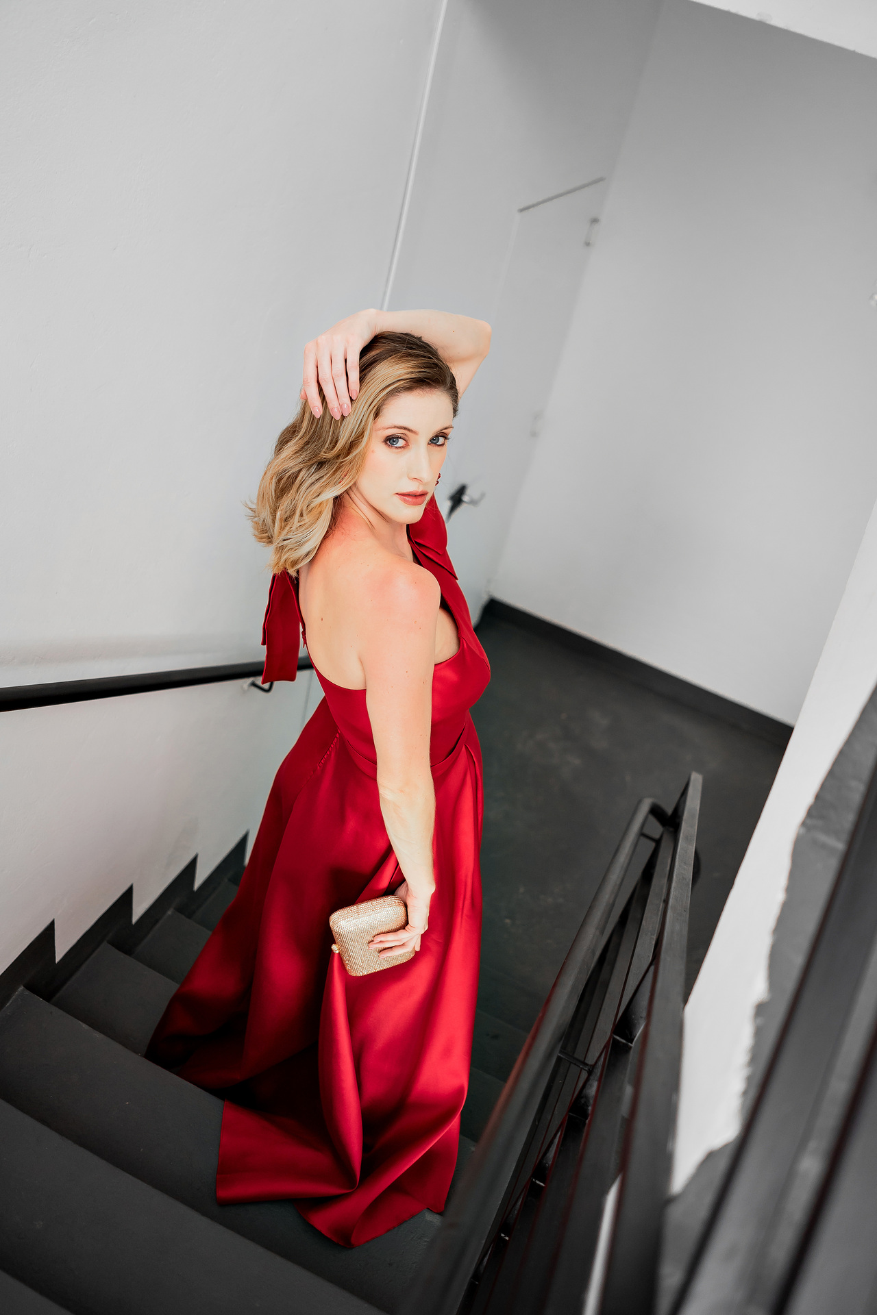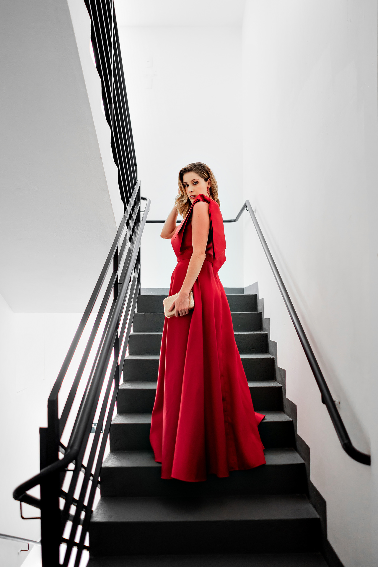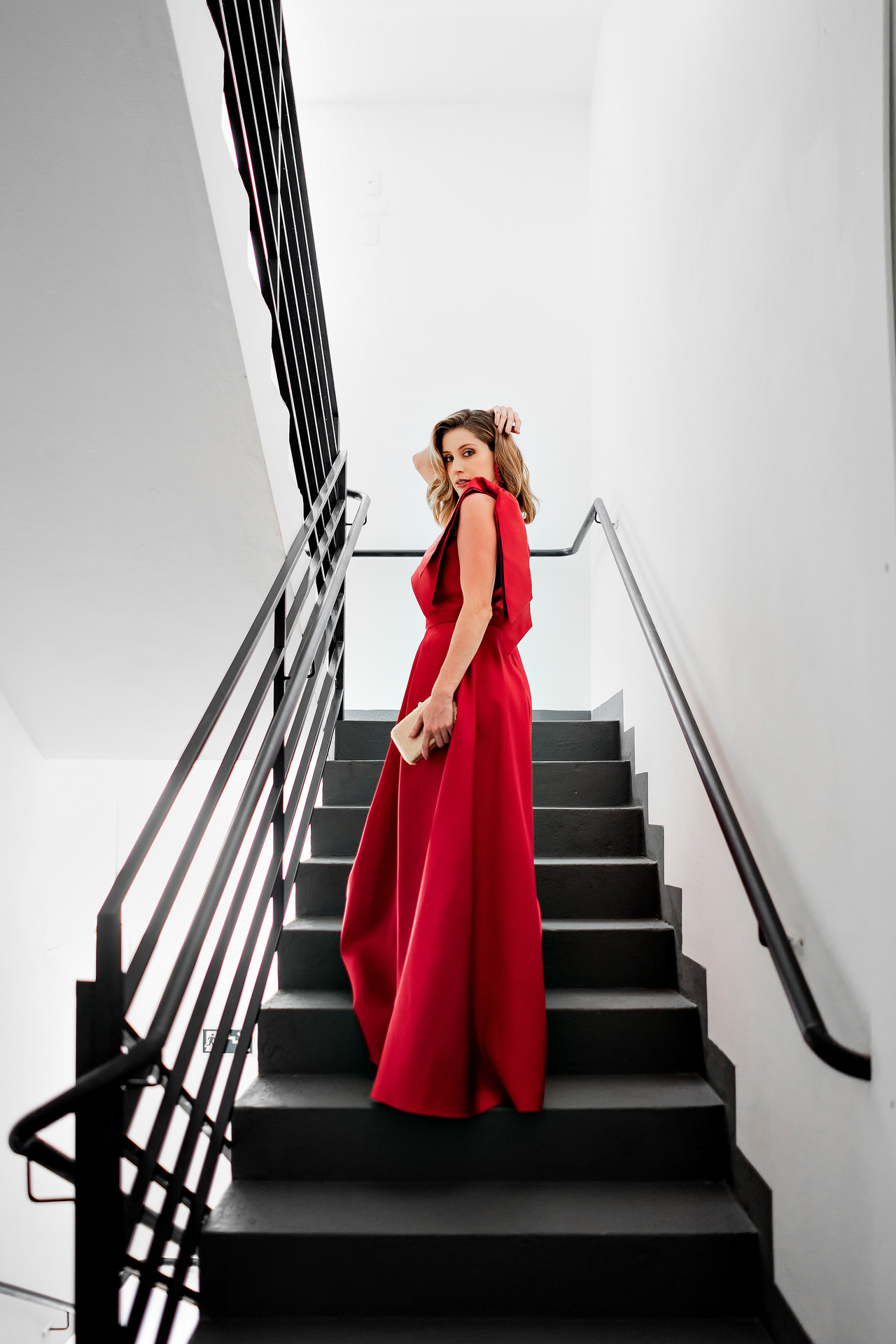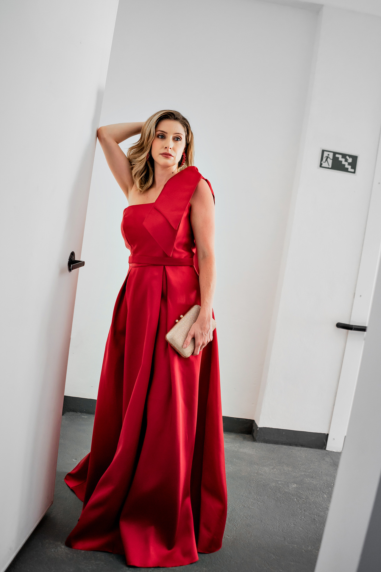 Este vestido em um tom profundo e vibrante de vermelho clássico é a expressão máxima de impacto e sofisticação. O design de um ombro só é realçado por um grande laço estruturado no ombro, que confere um toque dramático e elegante, chamando a atenção para a parte superior do corpo. O corpete é ajustado, com pregas delicadas que delineiam a cintura, criando uma silhueta feminina e bem definida.