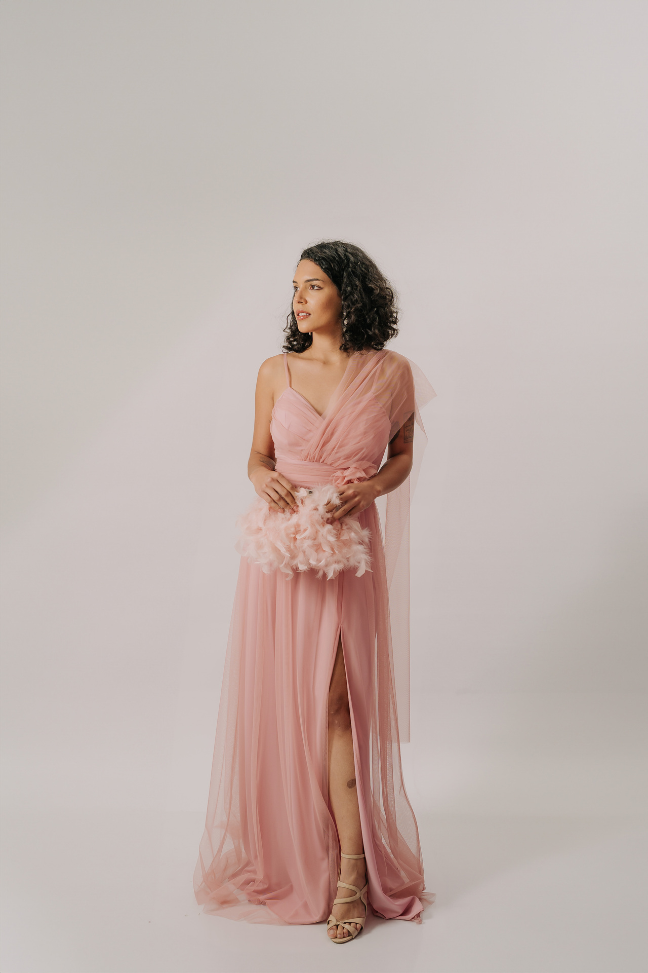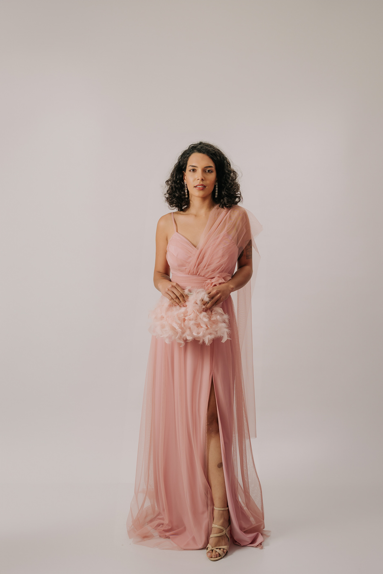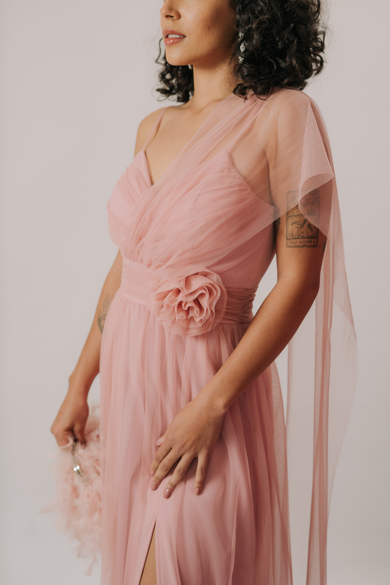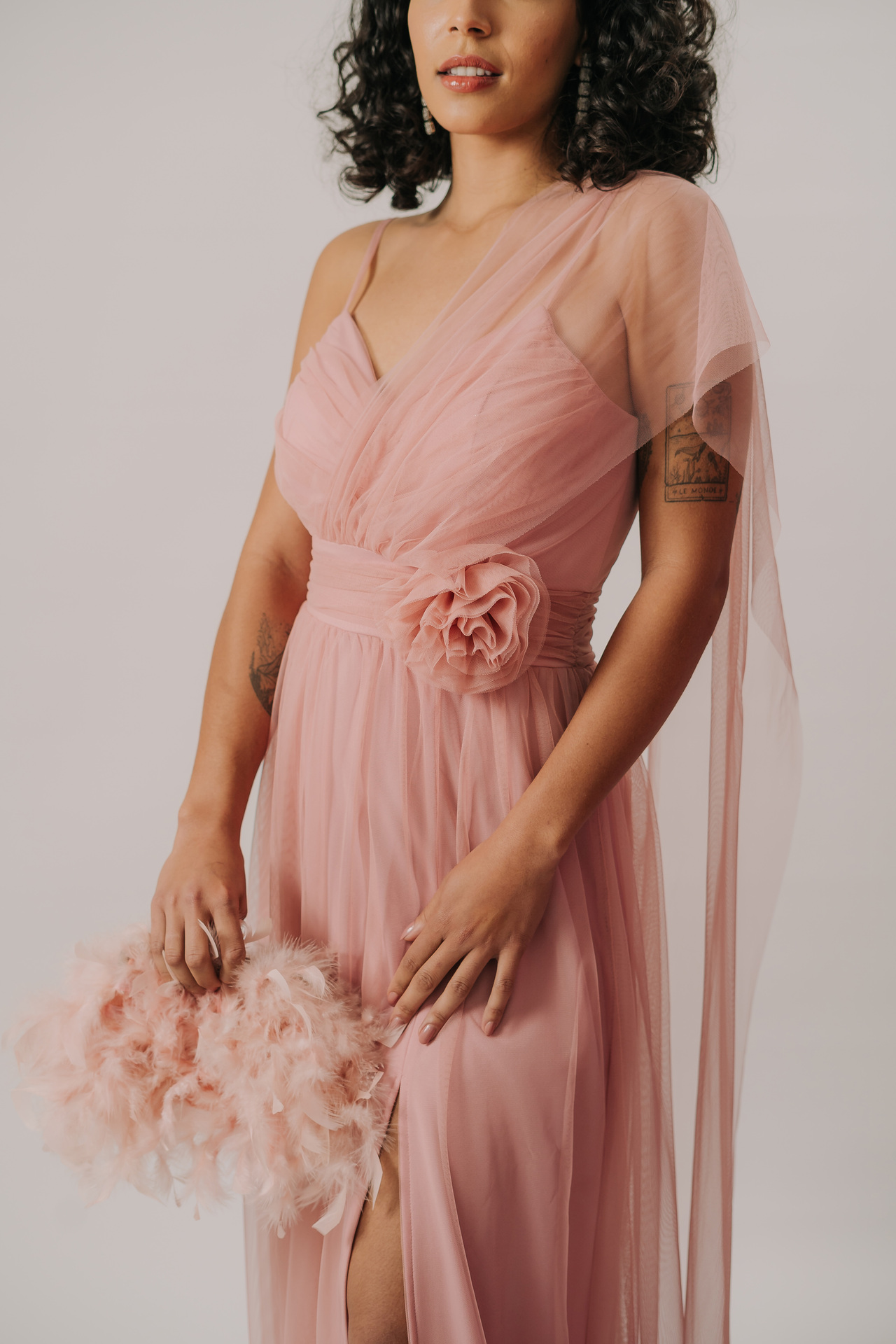 Vestido em tule com detalhe floral e faixa “multiuso” frente e costas – Rosé