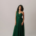 Vestido confeccionado em tule com faixa frente e costas que pode ser usada de várias formas diferentes. Esse modelo apresenta decote em “V” com alças finas e detalhe drapeado. A cintura possui cós com detalhe de tule drapeado e aplicação de flor na cintura. A saia longa é levemente franzida na linha da cintura.