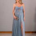 Vestido longo azul serenity com brilho e recortes frontais