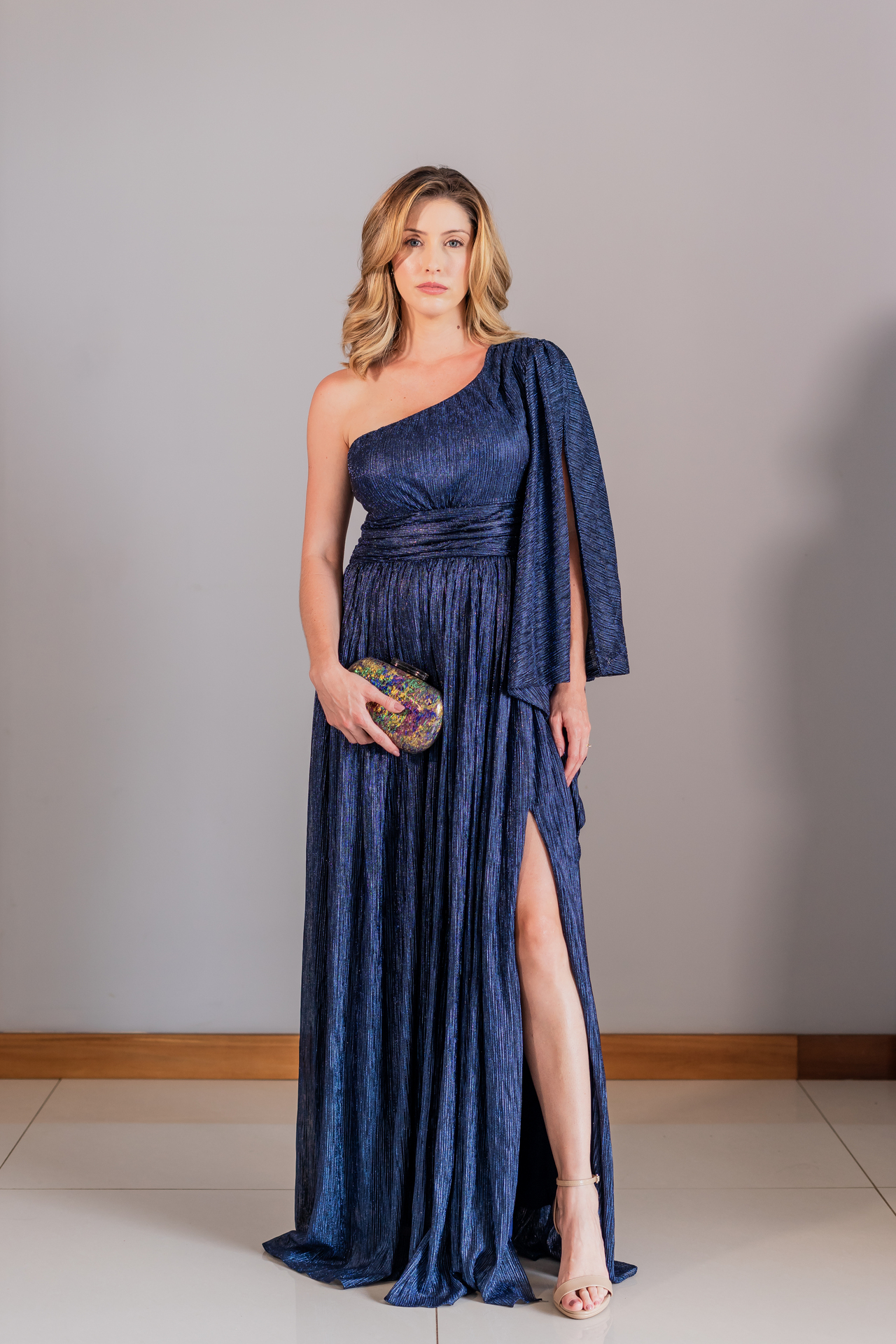 Vestido longo azul marinho de um ombro só com brilho