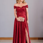 Vestido longo vermelho com brilho e decote ombro a ombro