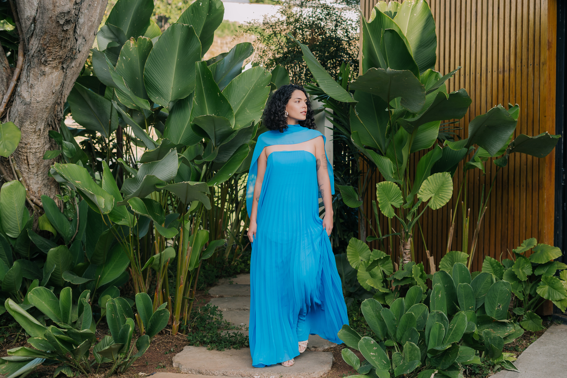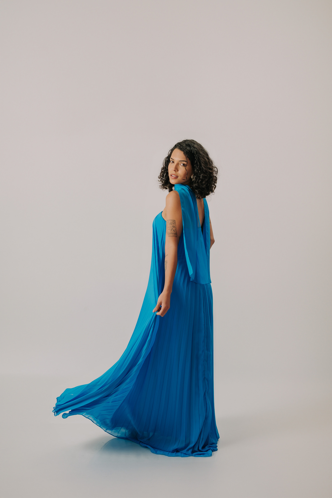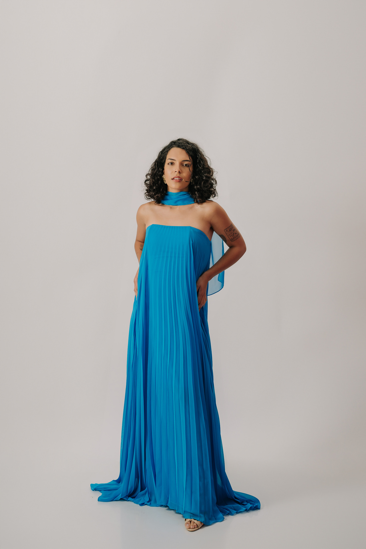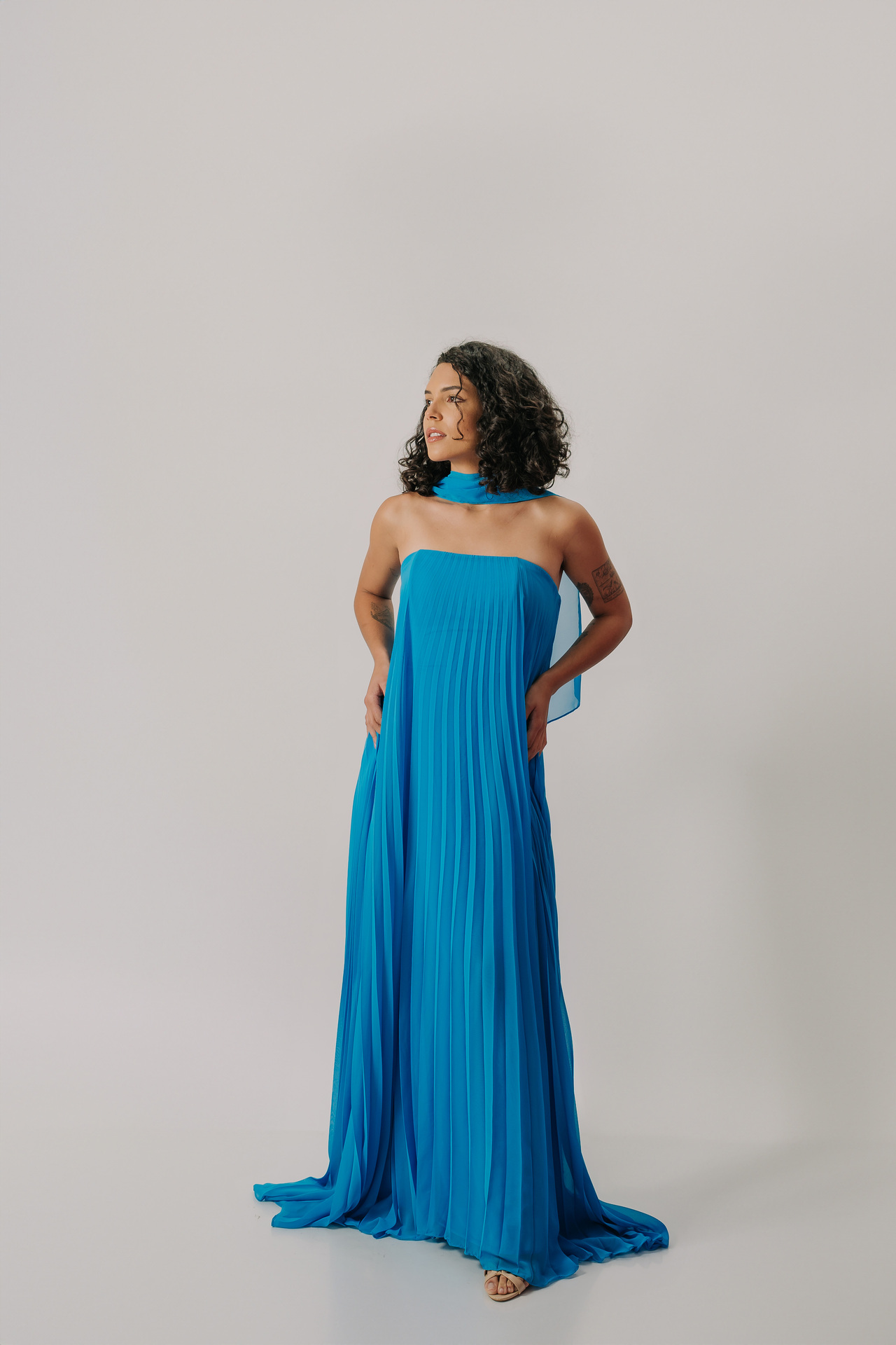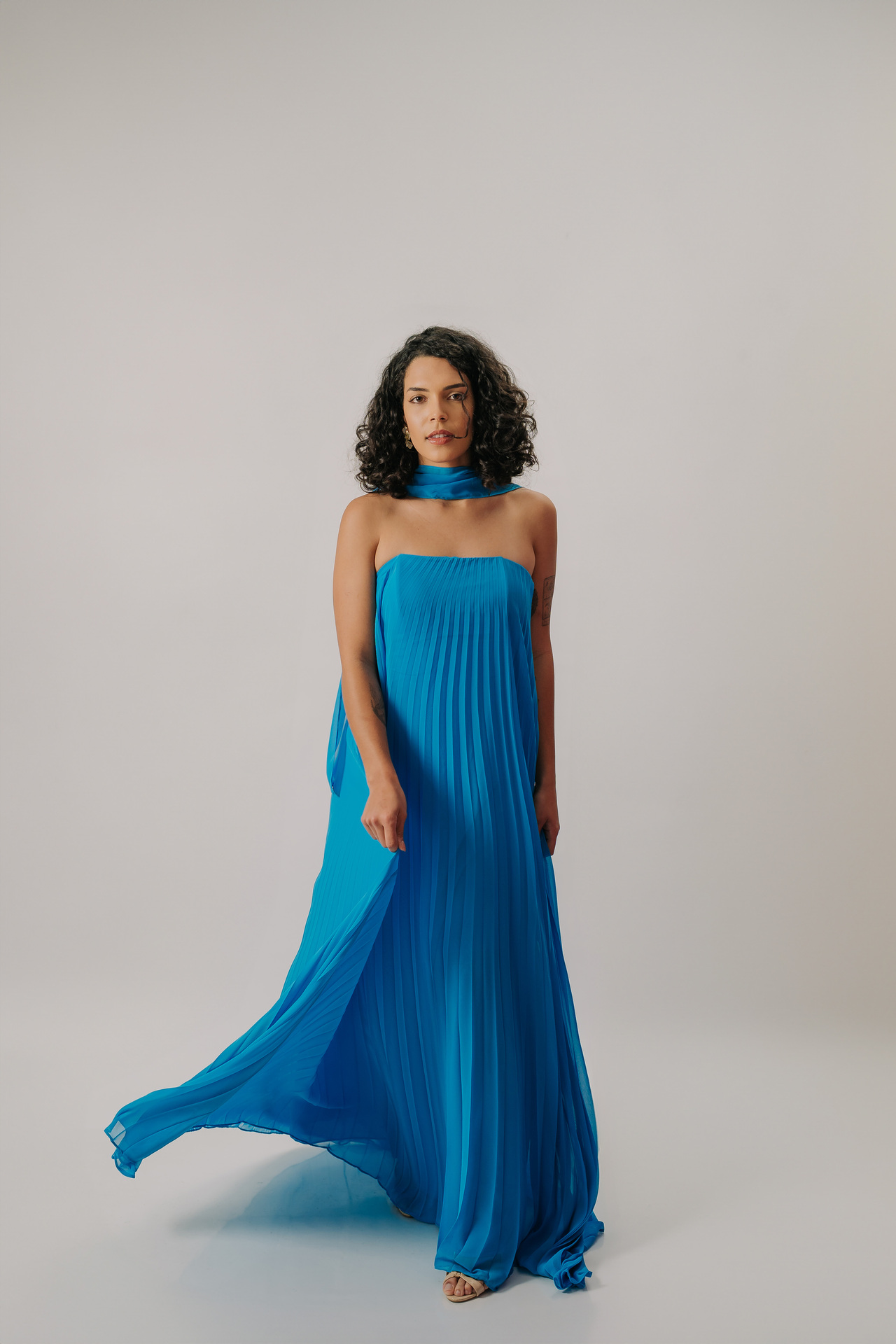 Vestido longo azul vibrante confeccionado em chiffon plissado, que garante leveza e movimento a cada passo. O modelo é tomara que caia, com caimento solto e fluido, proporcionando conforto e elegância. Acompanha faixa do mesmo tecido e cor, que pode ser usada na cintura ou no pescoço como um detalhe sofisticado e moderno.