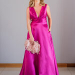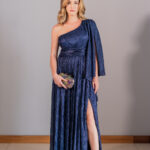 O modelo possui busto drapeado com torção central, alças finas e recortes estratégicos na região do abdômen. A cintura marcada valoriza a silhueta, enquanto a saia longa com fenda frontal lateral garante leveza e sofisticação ao modelo.