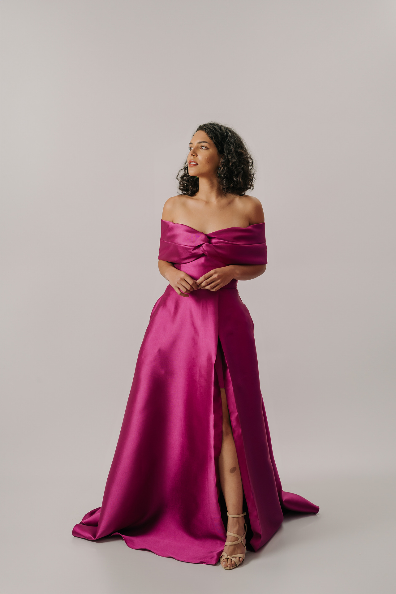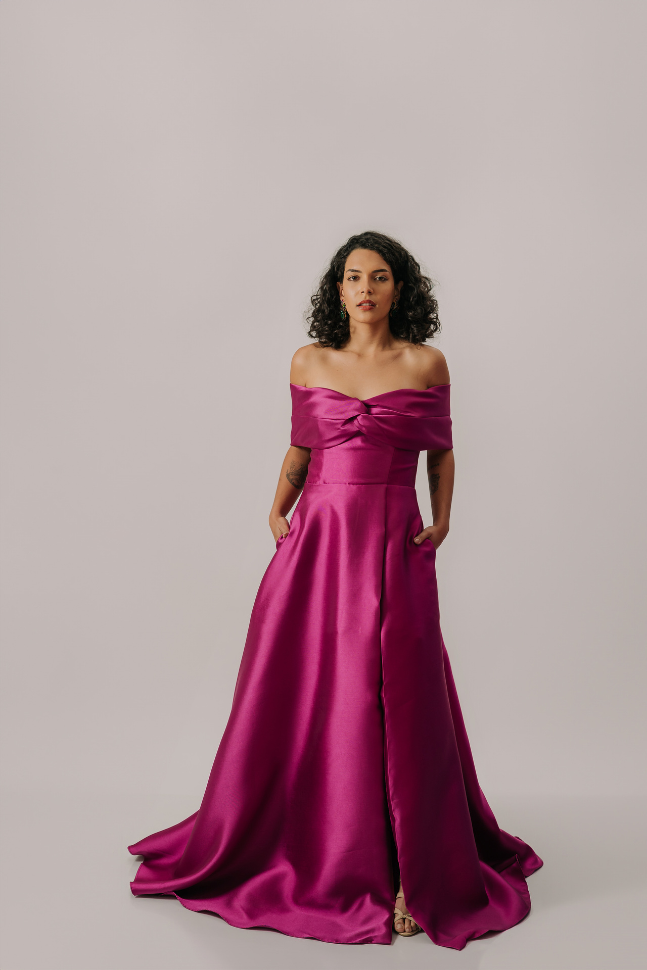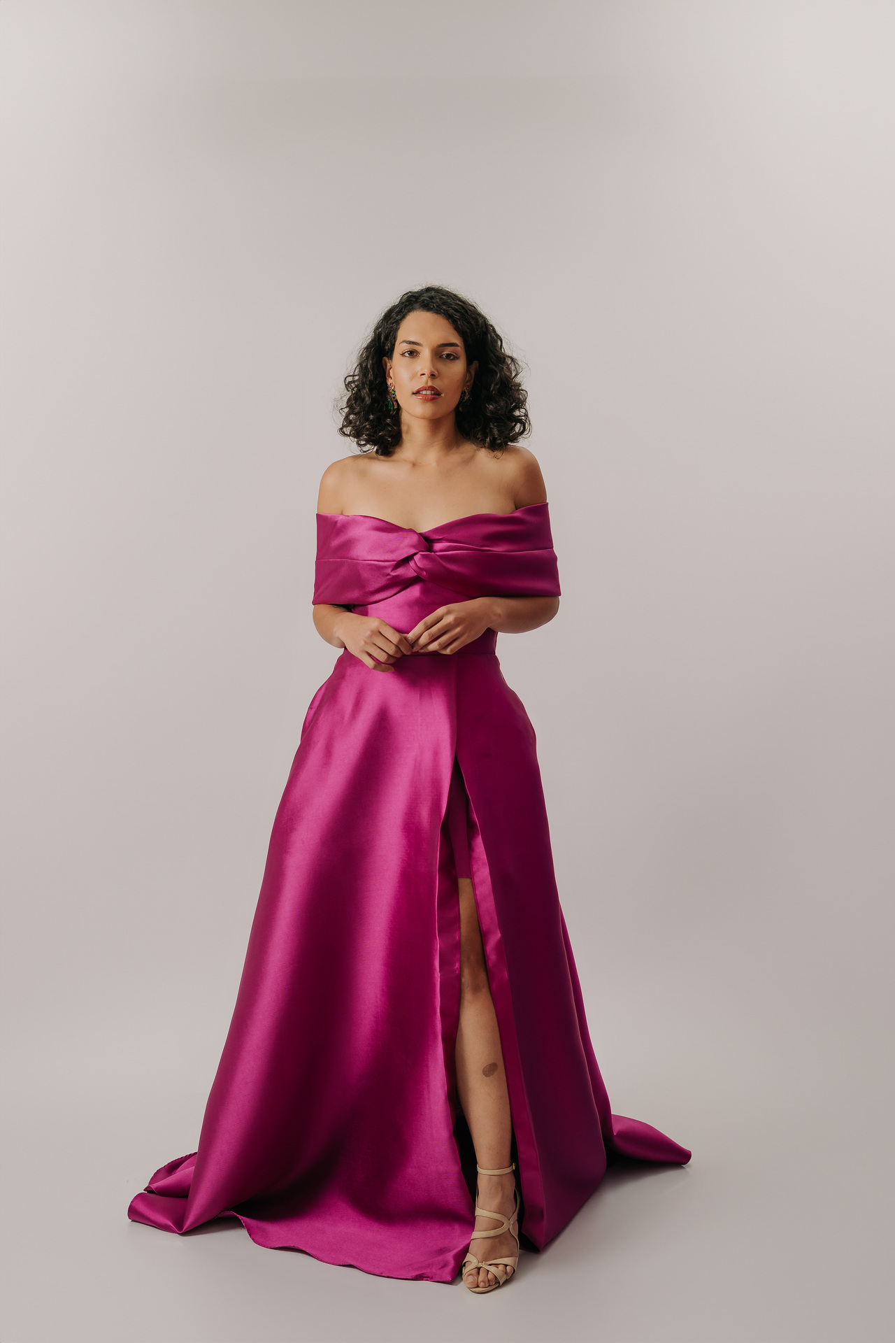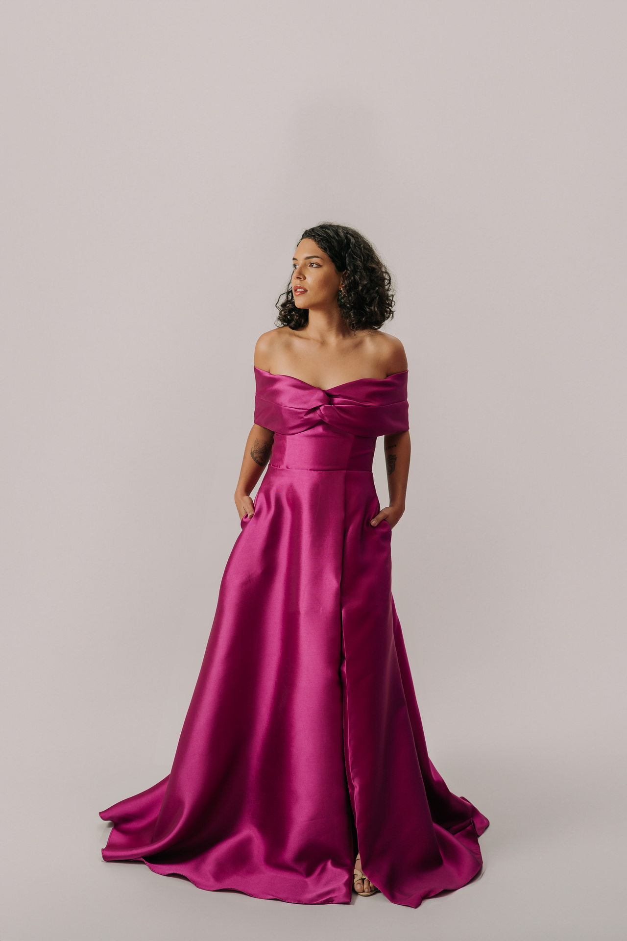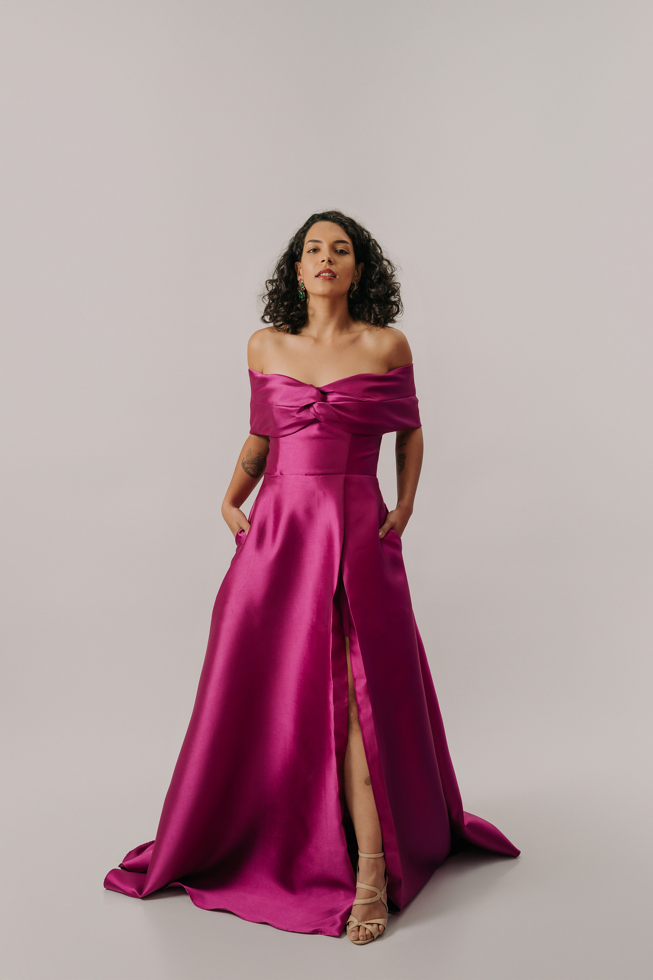 Vestido confeccionado em zibeline, tecido com brilho acetinado e caimento estruturado. O modelo apresenta decote ombro a ombro com detalhe de torção no meio, que valoriza a alonga o colo. A saia ampla possui fenda frontal lateral e uma saia curta interna, que funciona como um forro, trazendo sensualidade na medida.