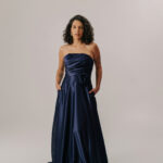 Triângulo Invertido: Excelente, o busto estruturado equilibra a parte superior, e a saia fluida com fenda adiciona movimento e volume à parte inferior.
