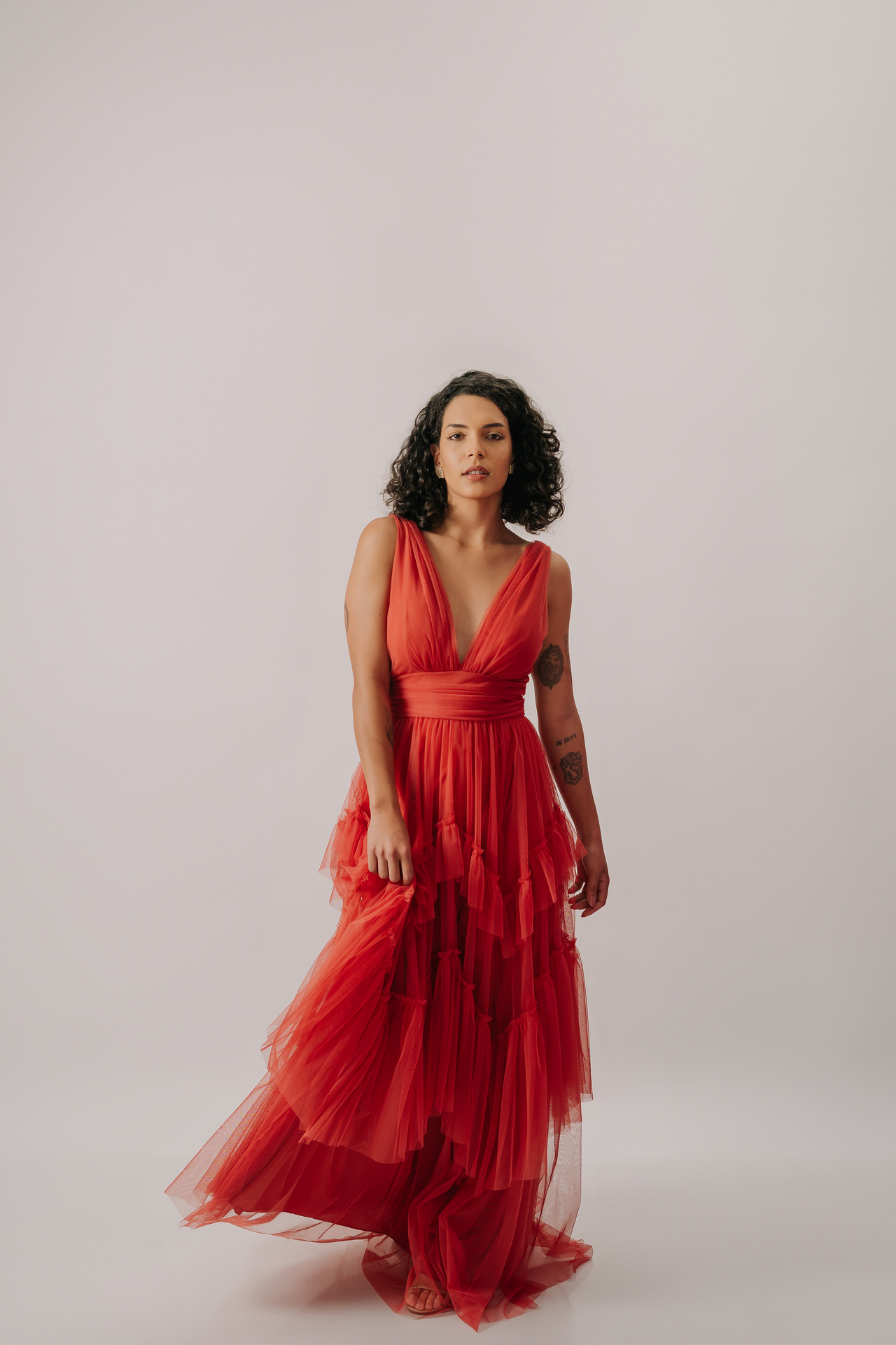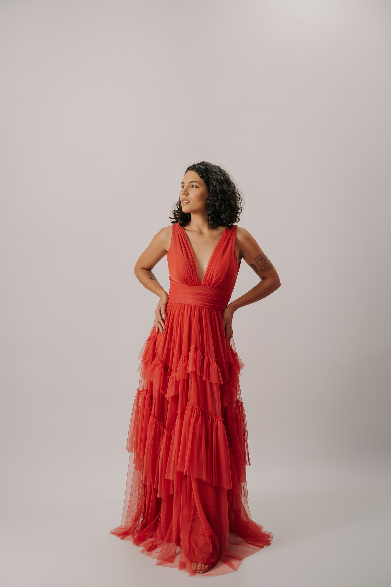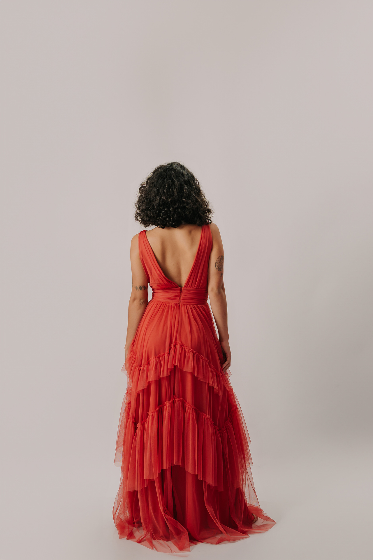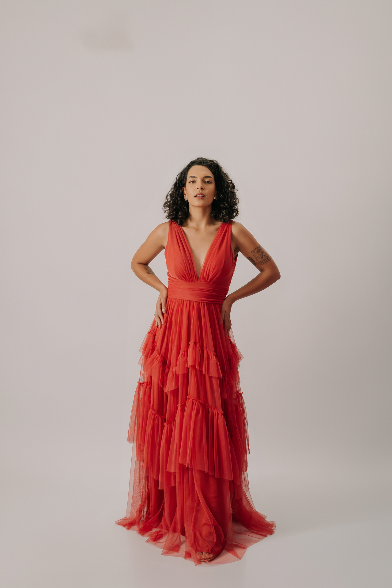 Vestido longo em tule, tecido leve com movimento fluido. O decote em “V” profundo e o cós franzido na cintura valorizam e alongam a silhueta. A saia em camadas traz um volume marcante e discreto. A cor terracota transmite elegância e sofisticação.