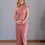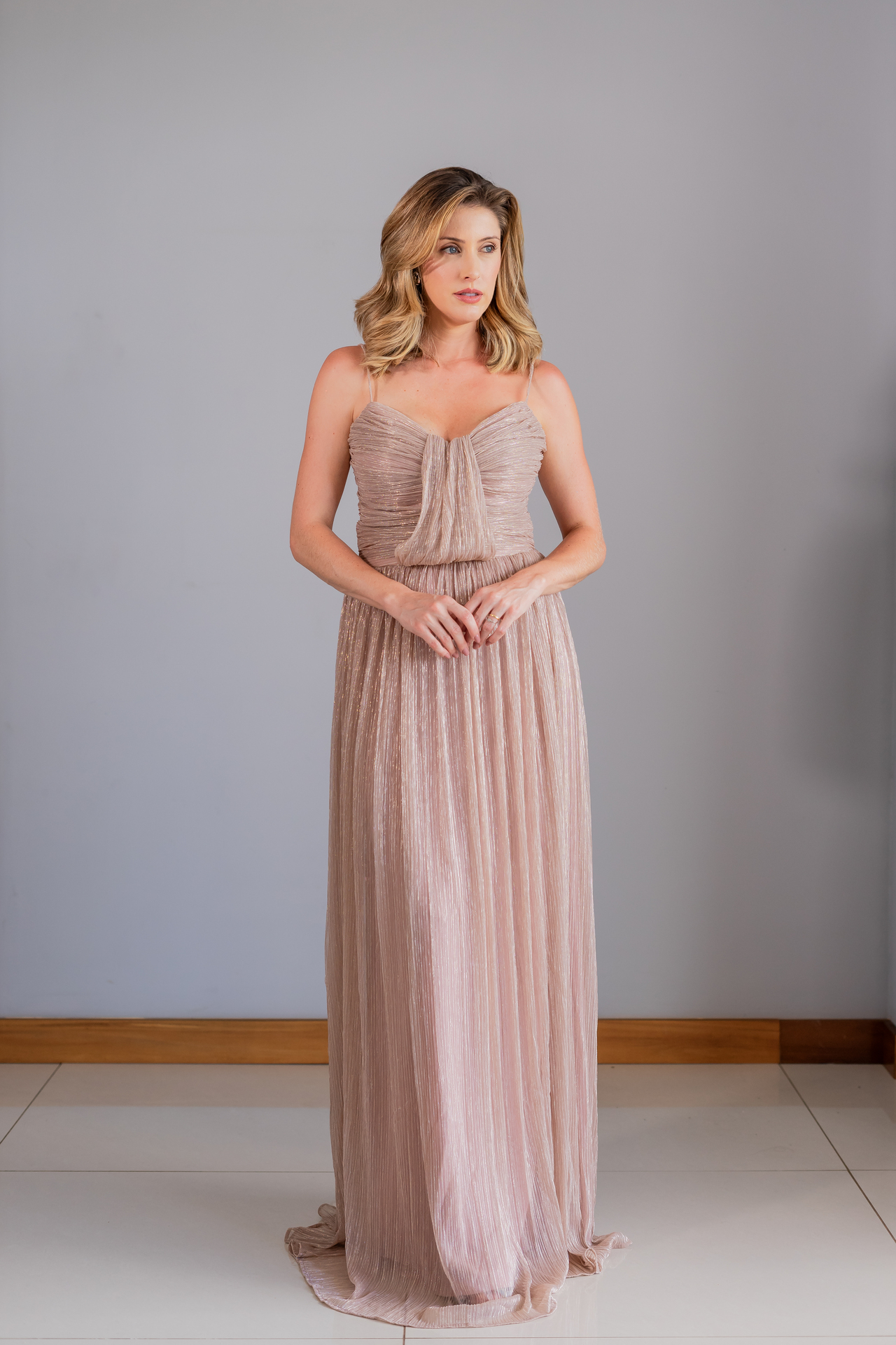 A modelagem é ajustada na parte superior, saia longa com leve franzido na cintura.