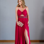 Vestido longo magenta com recorte frontal e bordado de pedrarias