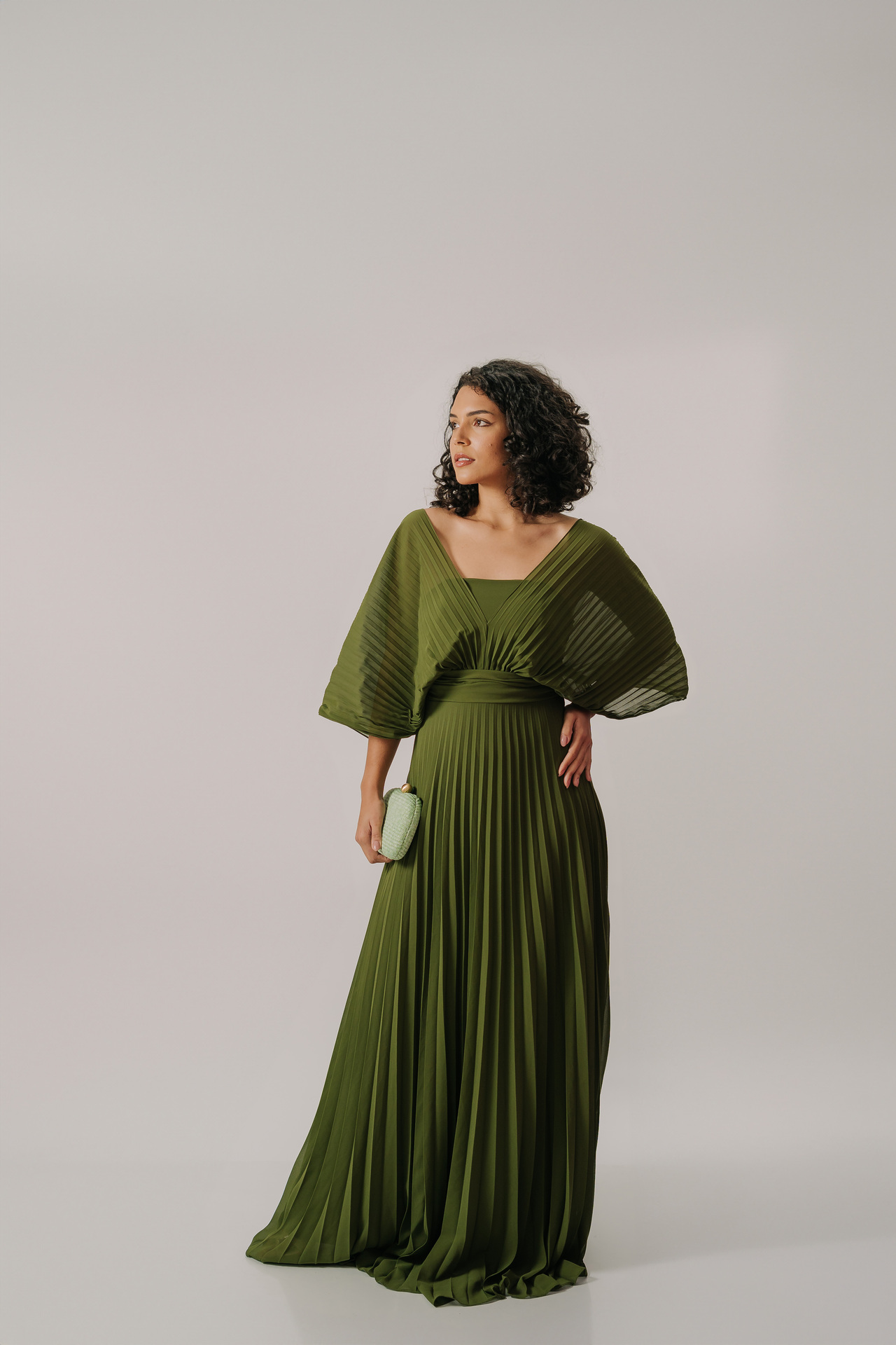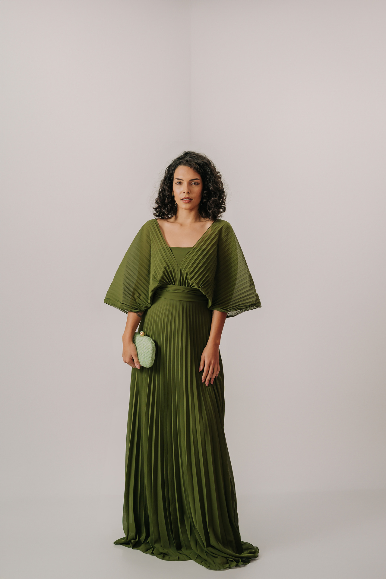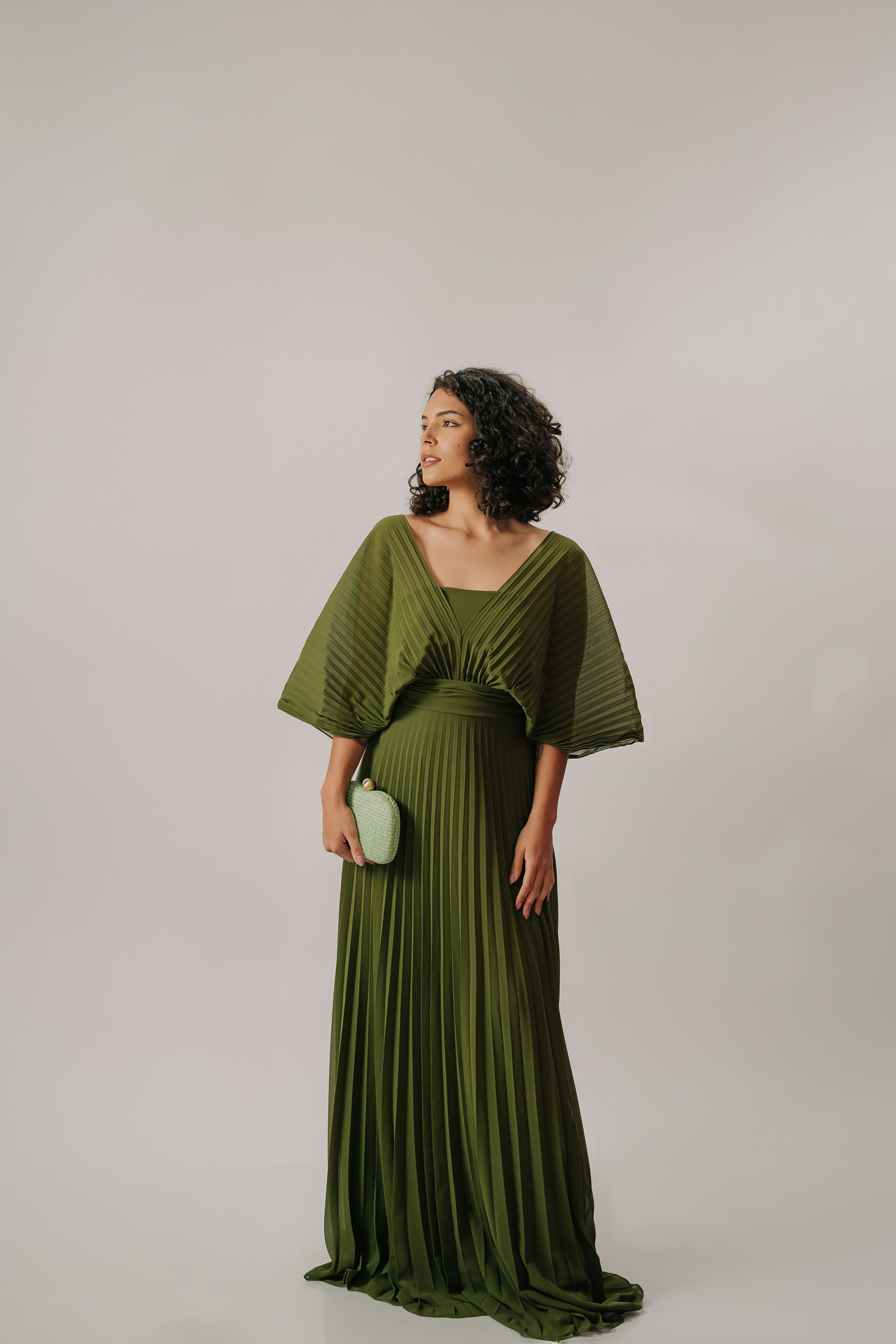 - Oval: Excelente, o decote V alonga e as mangas amplas disfarçam os braços, enquanto a saia plissada flui sem marcar.