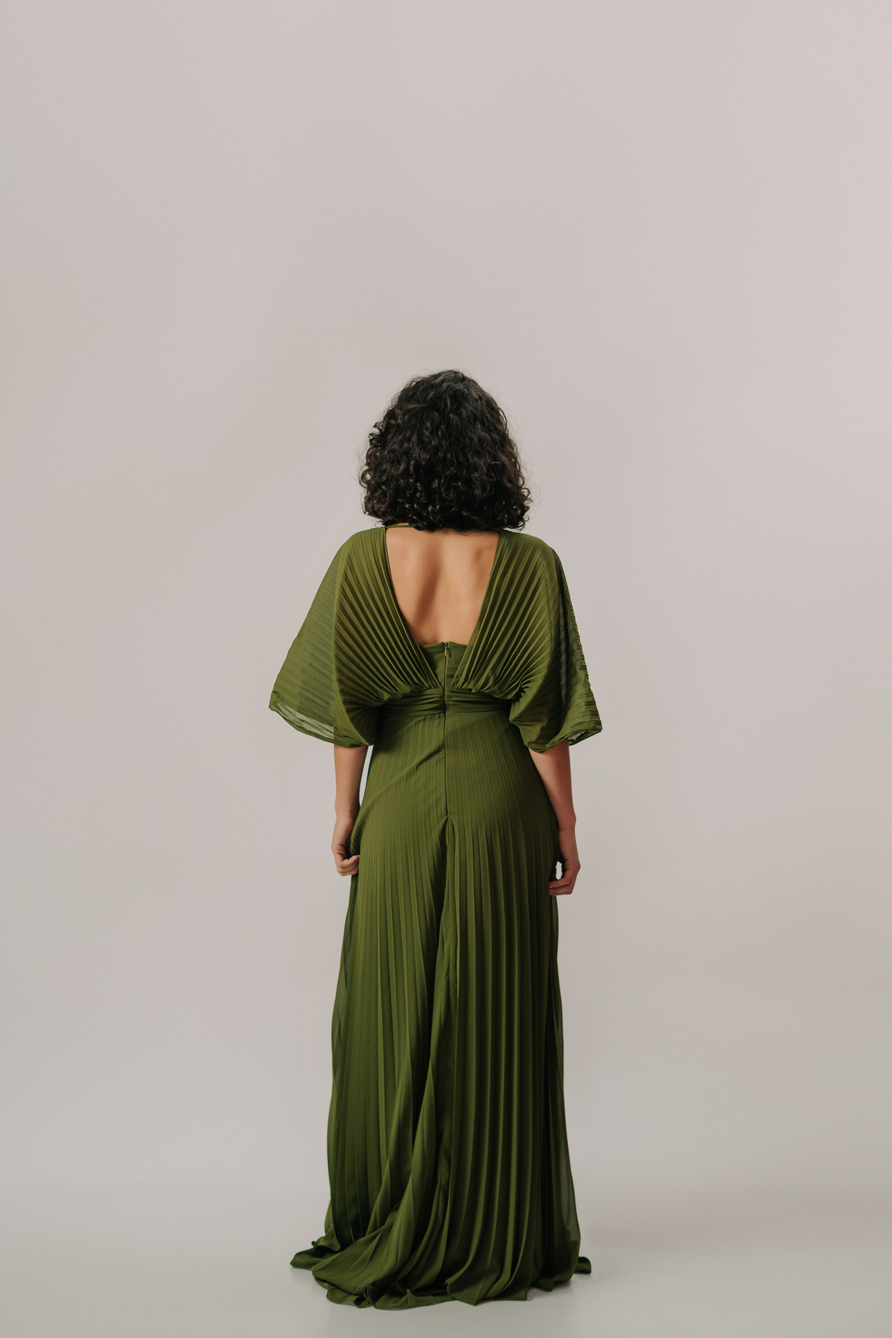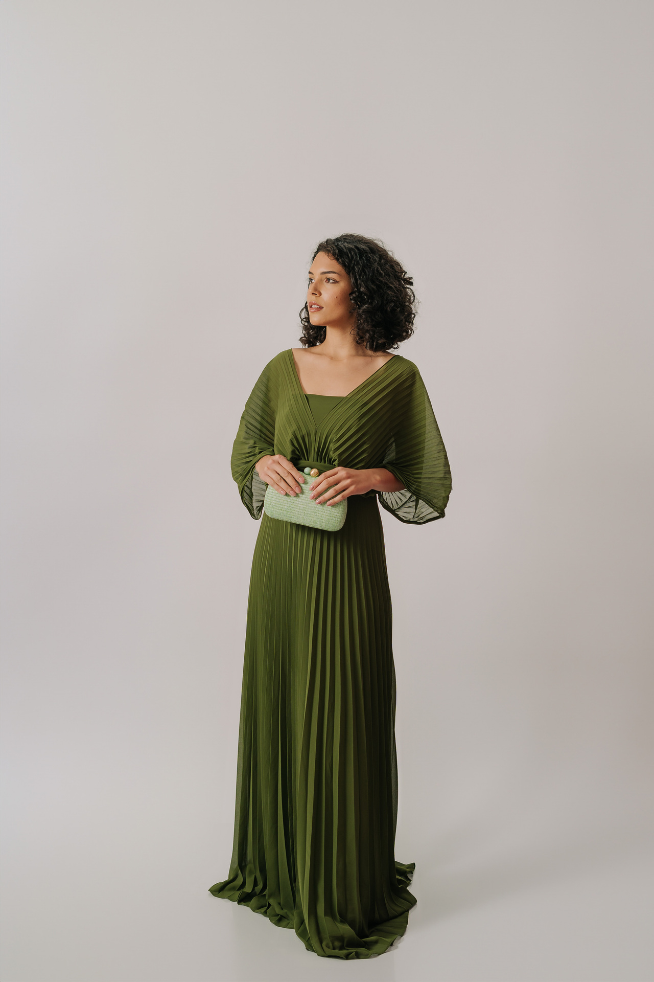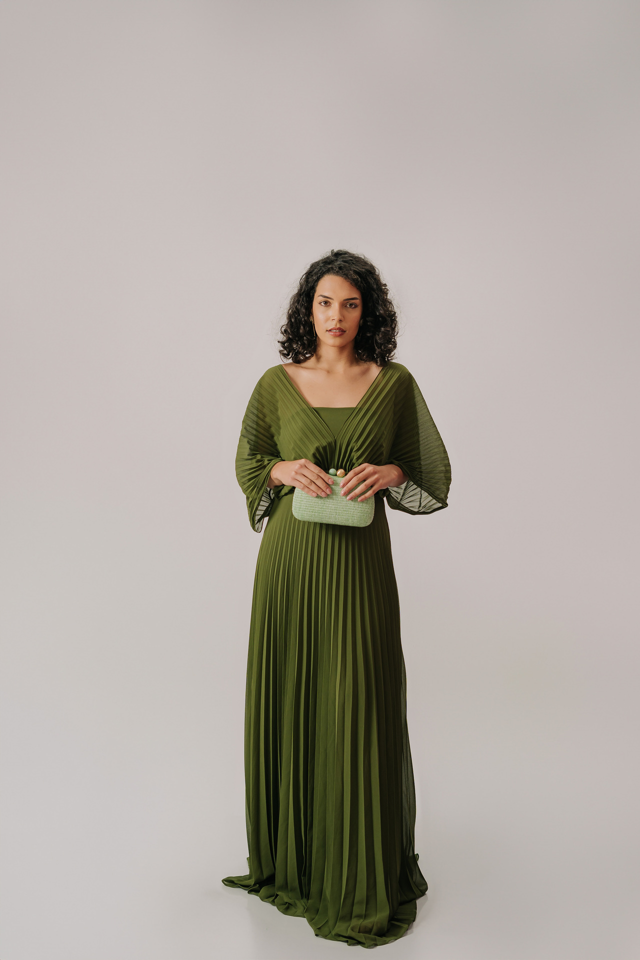 - Oval: Excelente, o decote V alonga e as mangas amplas disfarçam os braços, enquanto a saia plissada flui sem marcar.