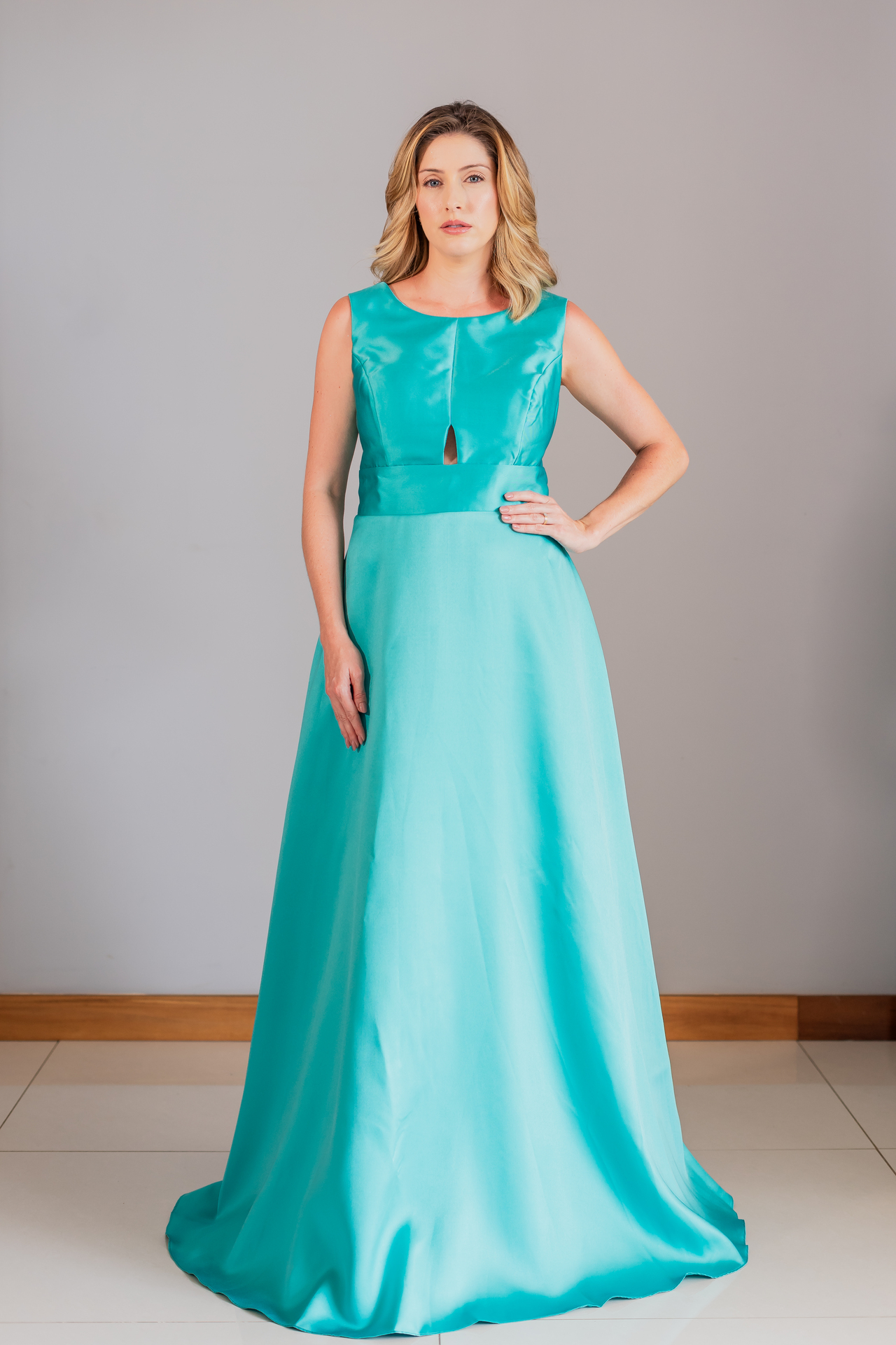 Vestido longo turquesa com decote canoa e recorte frontal