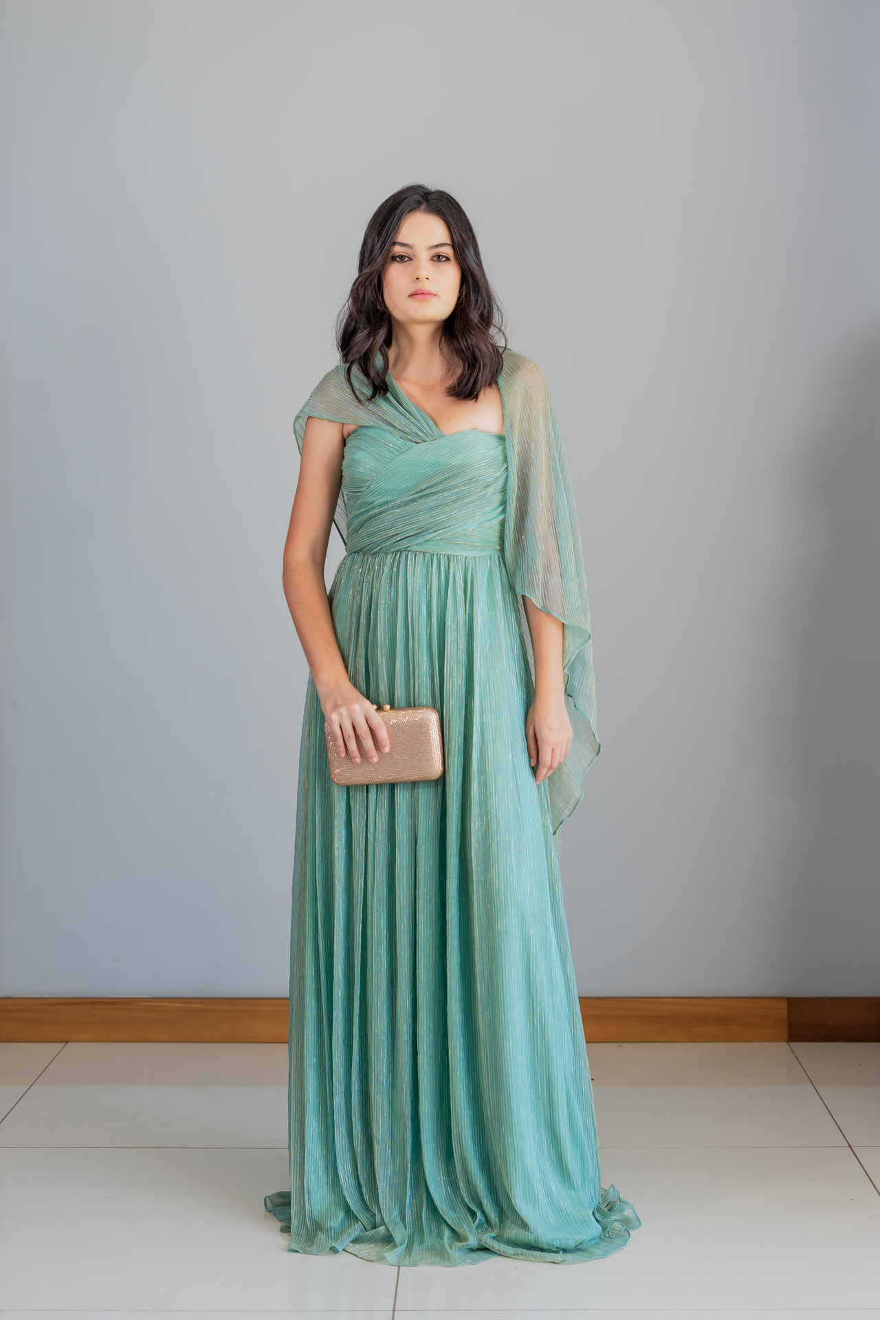 Vestido longo confeccionado em tecido fluido com fios brilhantes na cor turquesa.