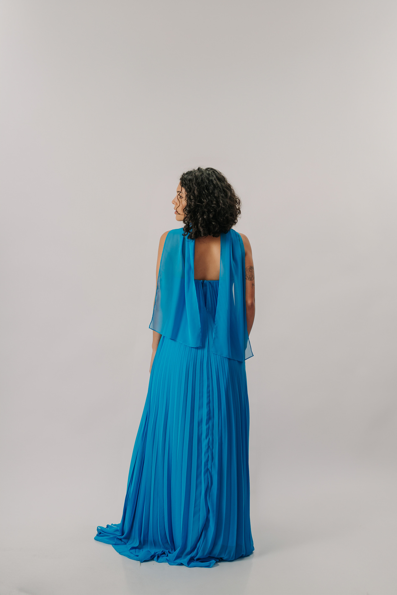 Vestido longo azul plissado tomara que caia com faixa avulsa