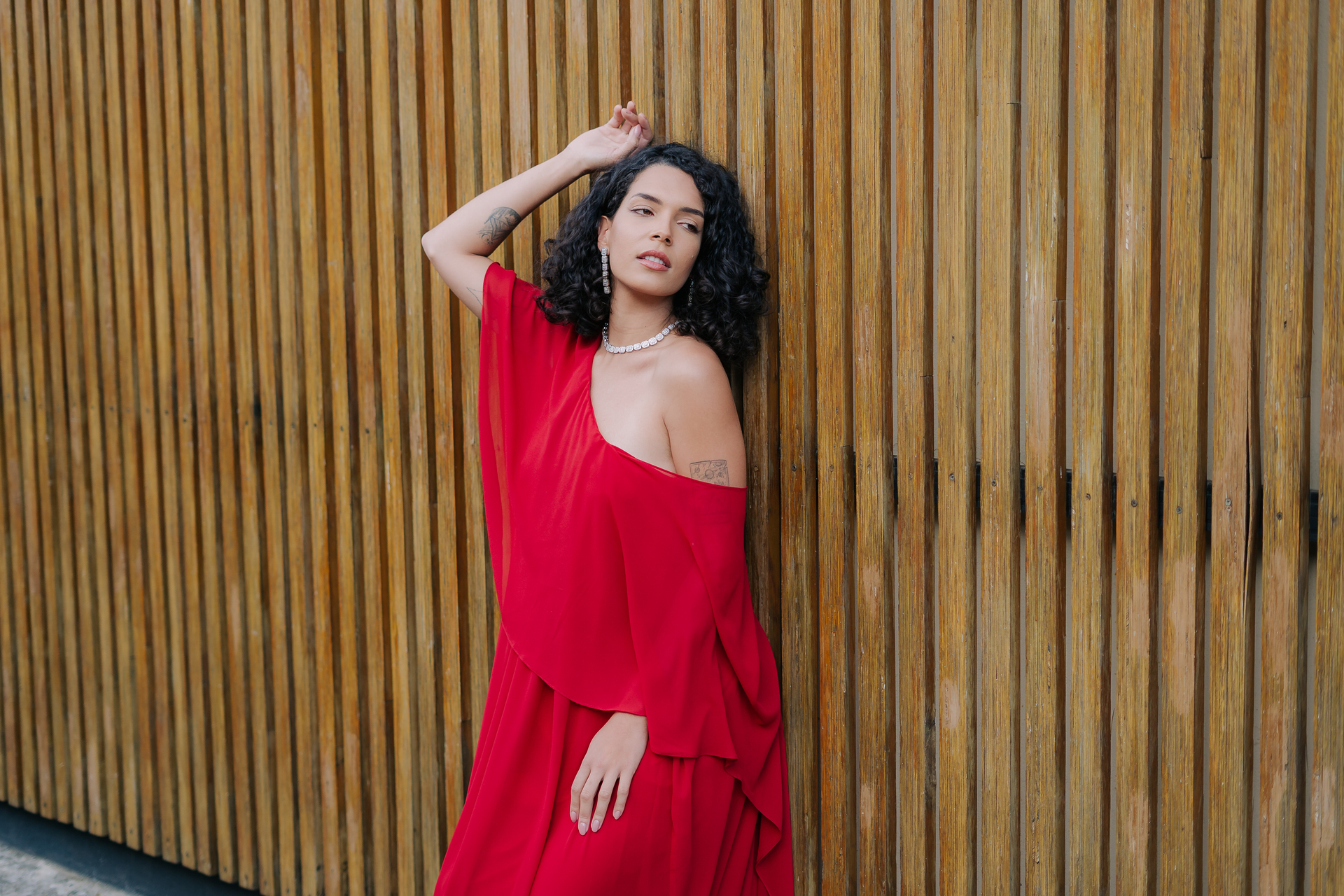 Vestido longo vermelho vibrante, confeccionado em tecido leve e fluido, proporcionando movimento e elegância. O modelo apresenta decote assimétrico de um ombro só, com sobreposição de babado que adiciona charme e sofisticação. A silhueta solta garante conforto e caimento que disfarça todas as imperfeições.