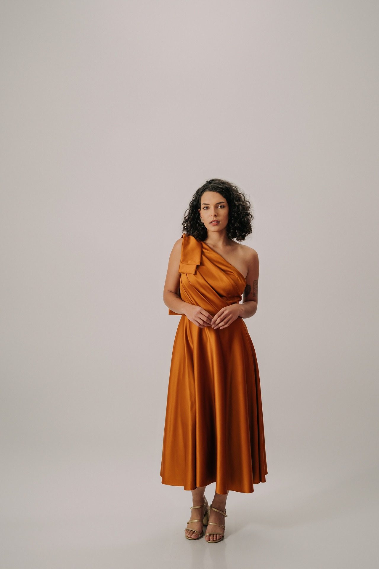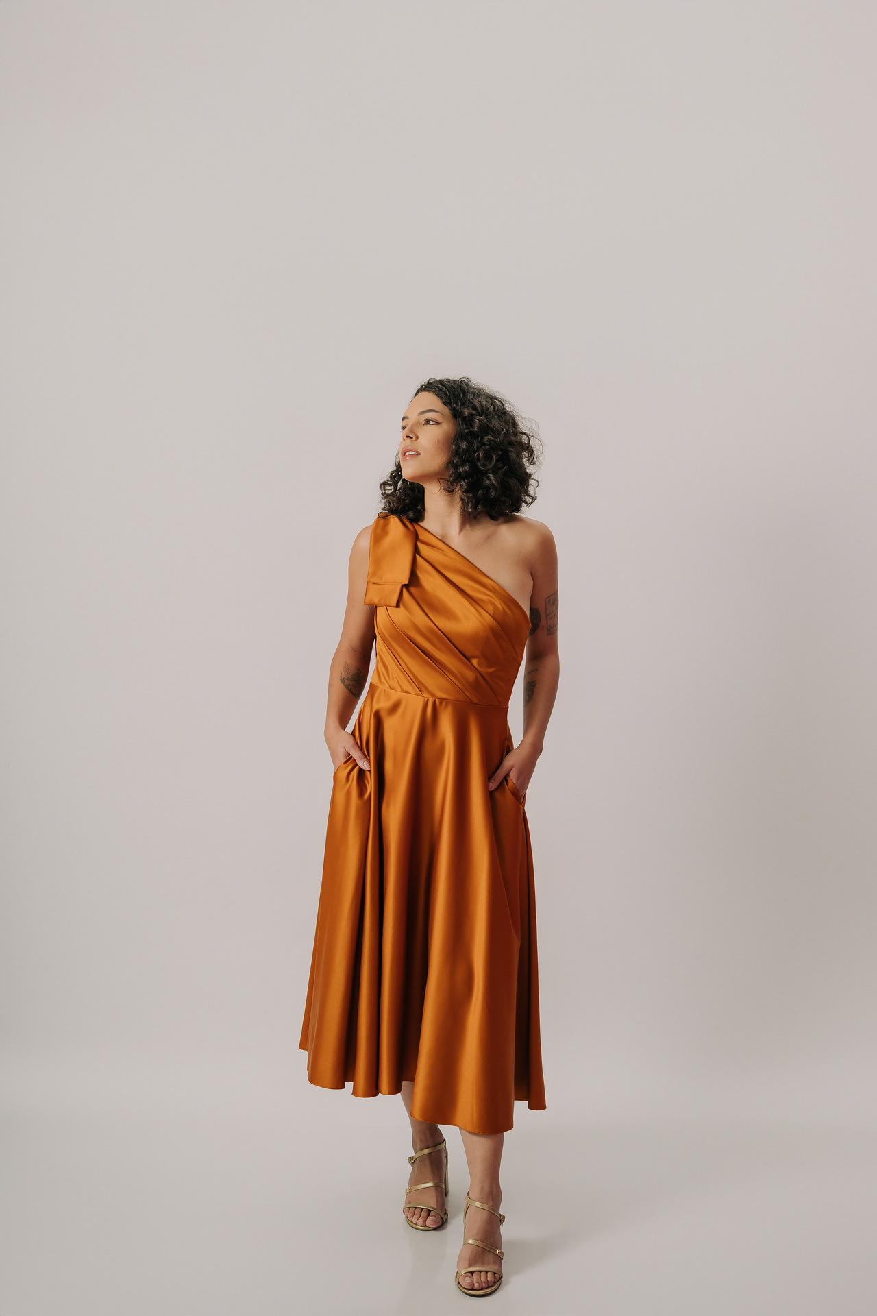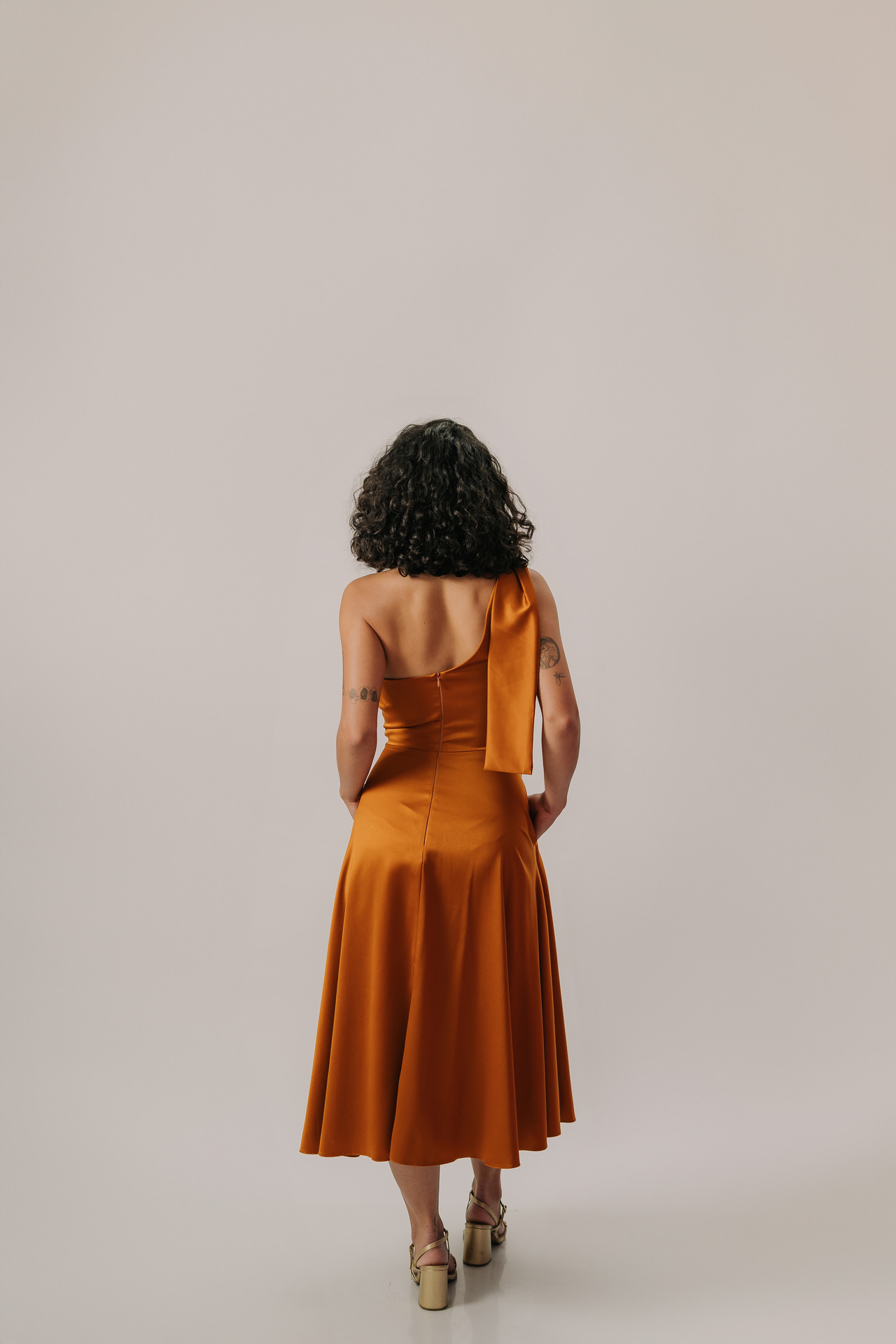Modelo confeccionado em crepe, tecido com estrutura fluida e acabamento acetinado. O modelo possui decote de um ombro só com detalhe de laço na alça e efeito drapeado. A saia midi em linha A confere movimento e leveza, enquanto os bolsos laterais trazem funcionalidade e adicionam praticidade ao visual.