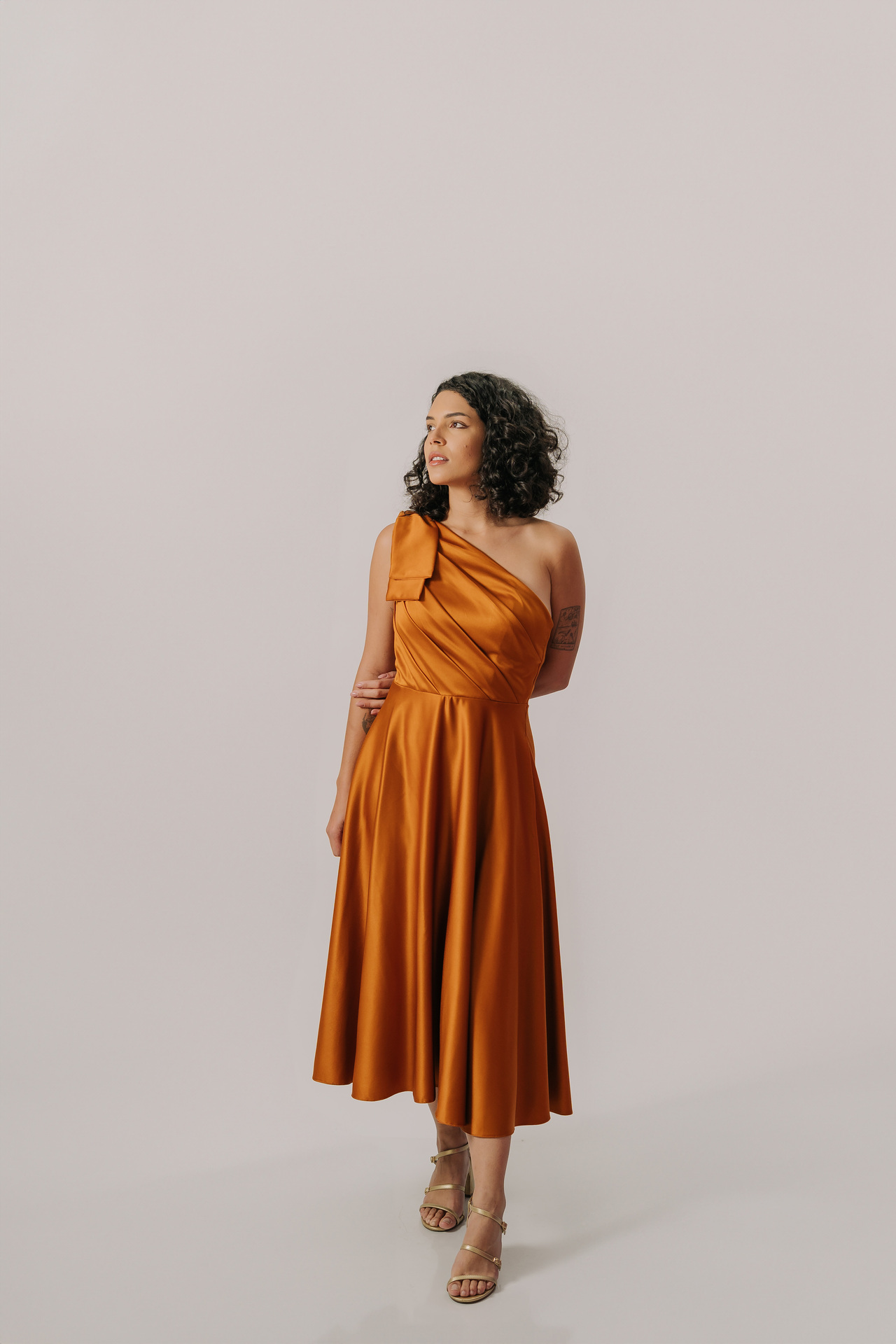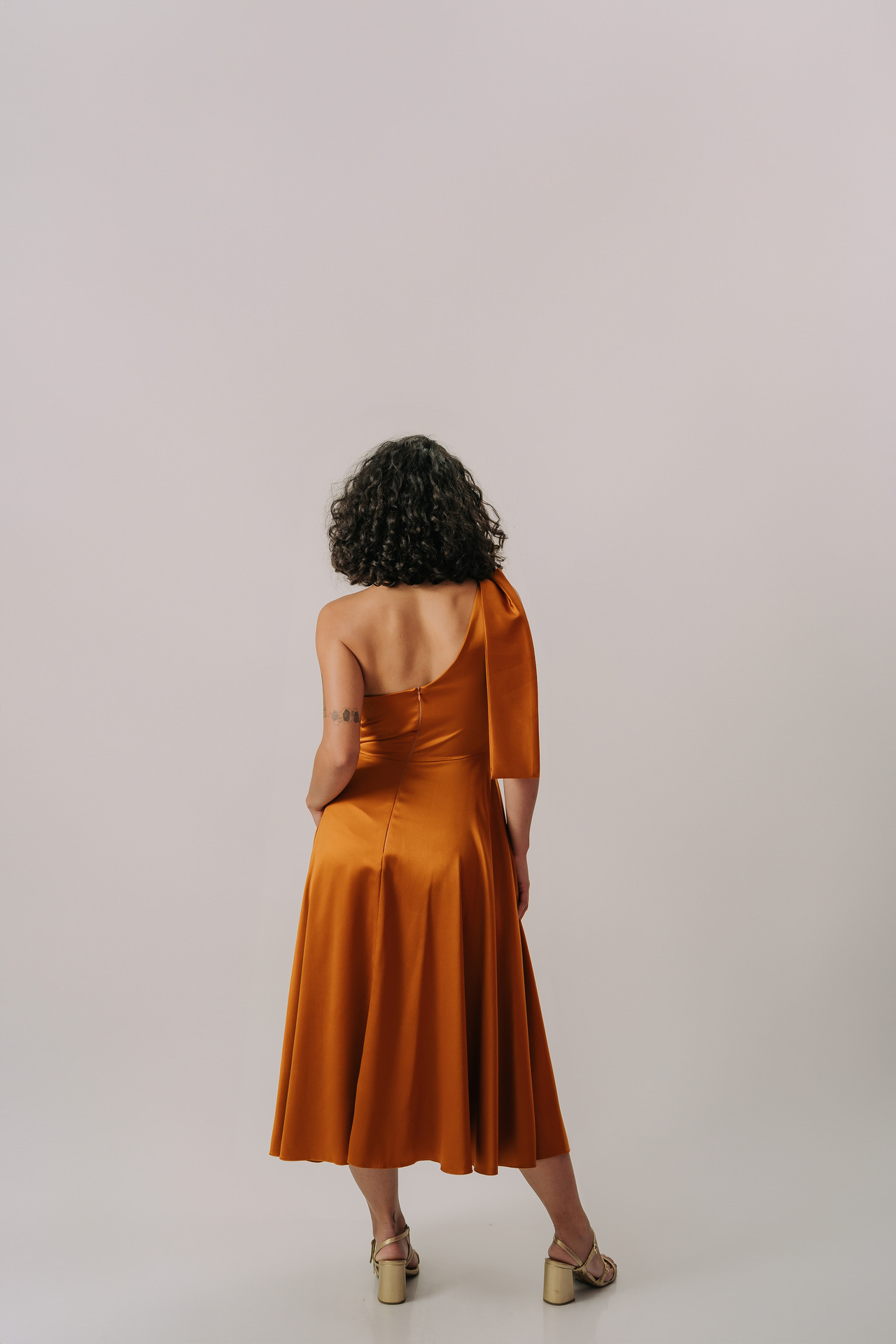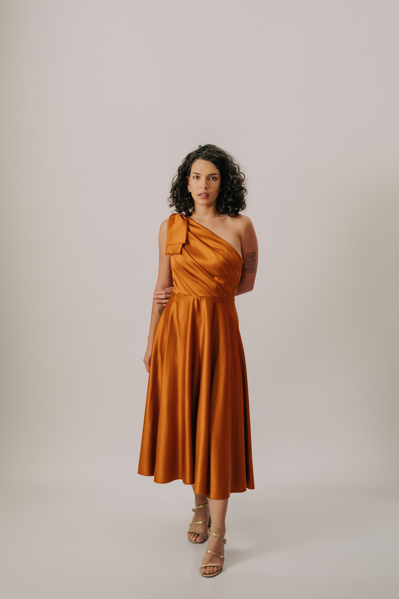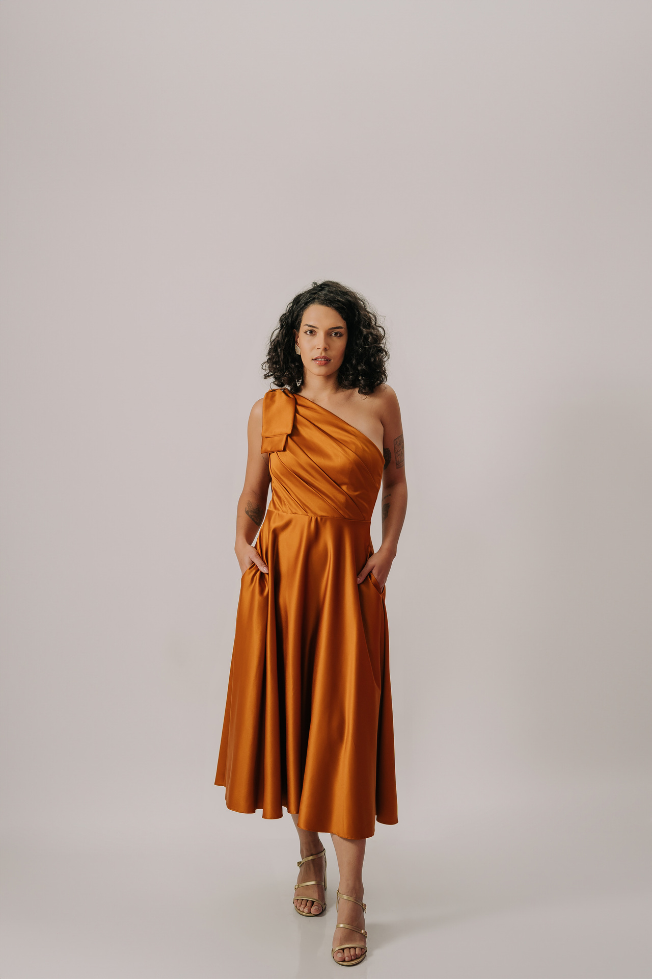 Modelo confeccionado em crepe, tecido com estrutura fluida e acabamento acetinado. O modelo possui decote de um ombro só com detalhe de laço na alça e efeito drapeado. A saia midi em linha A confere movimento e leveza, enquanto os bolsos laterais trazem funcionalidade e adicionam praticidade ao visual.