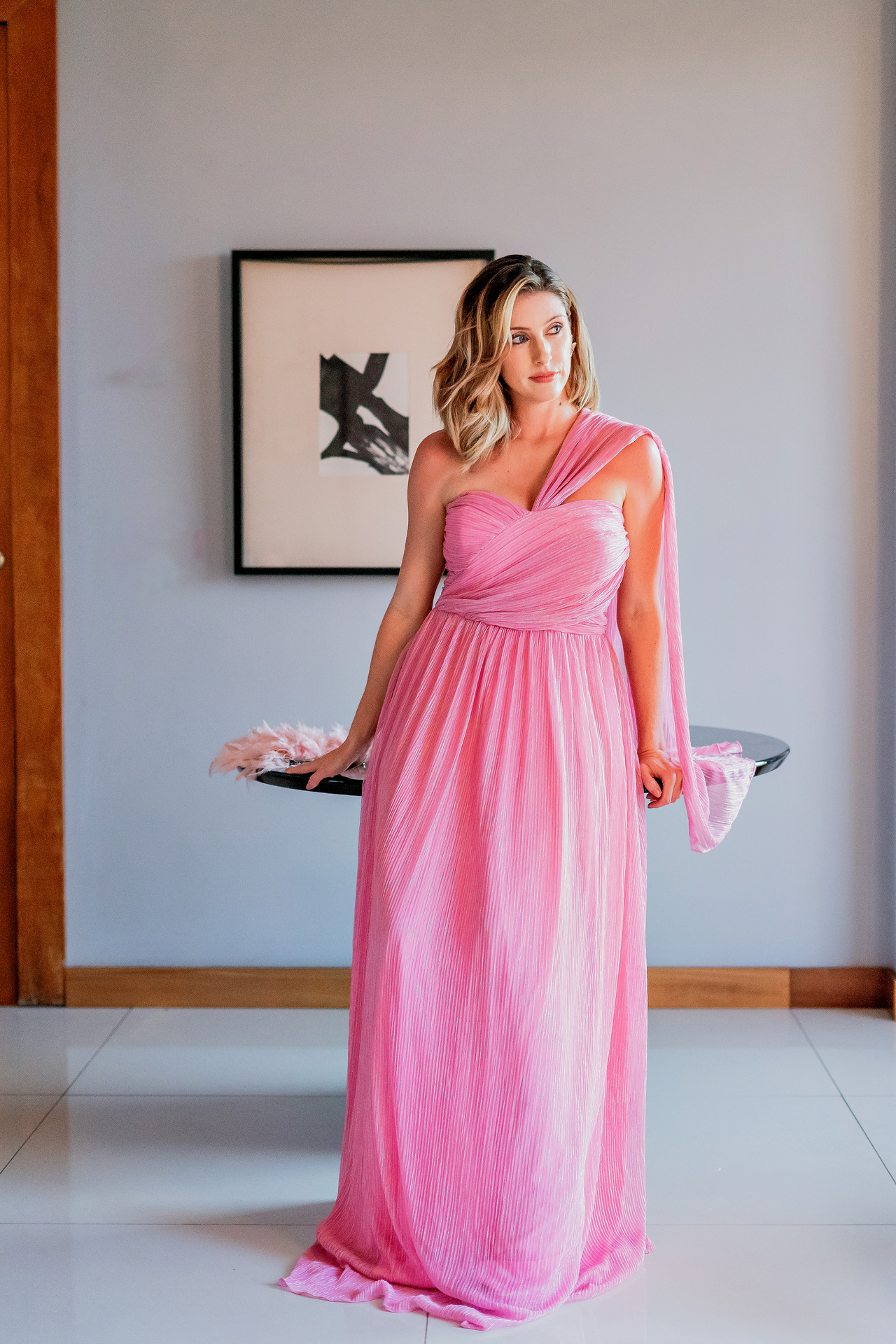 Este vestido rosa, com tecido plissado e um ombro só, é perfeito para eventos especiais. Sua modelagem valoriza as silhuetas Ampulheta, Oval, Retângulo, Triângulo Invertido e Triângulo/Pêra. O design elegante realça a cintura e proporciona um caimento fluido, adicionando sofisticação a qualquer tipo de corpo. Ideal para quem busca glamour e conforto em uma peça única e versátil.