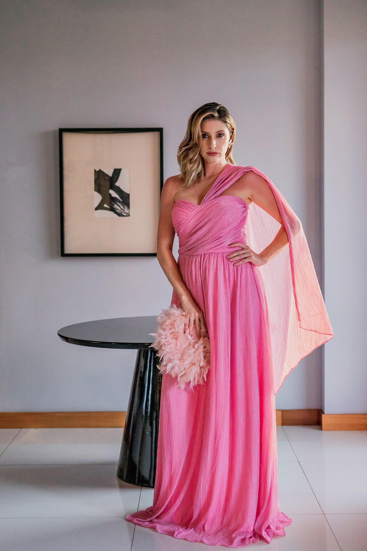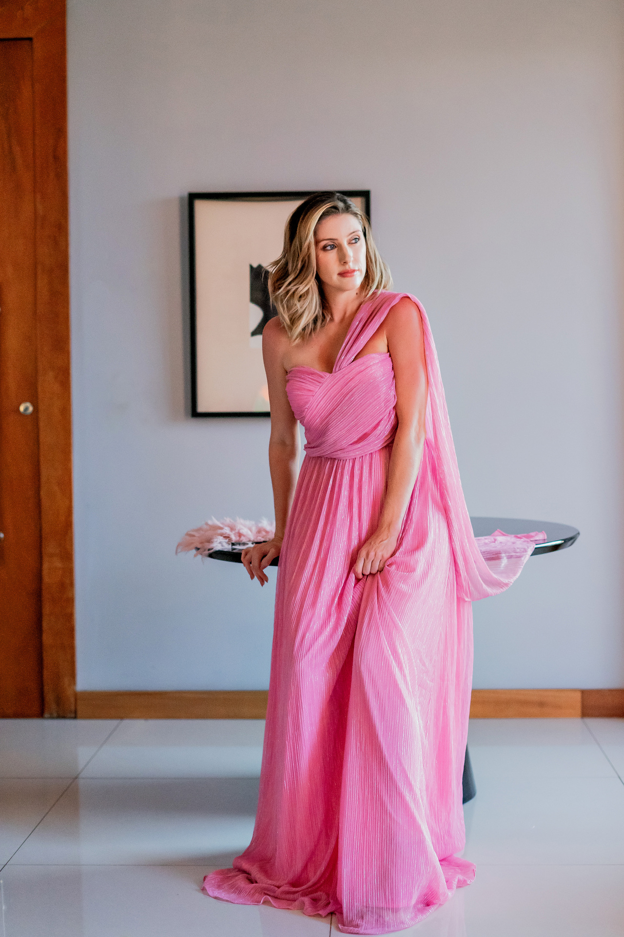 Este deslumbrante vestido em um tom vibrante de rosa é a personificação da feminilidade e da sofisticação. Confeccionado em um tecido leve com um caimento fluido e uma textura plissada sutil, ele proporciona um movimento gracioso a cada passo. O design de um ombro só apresenta um drapeado elegante que se estende por um dos lados, criando um efeito de capa delicado e etéreo, adicionando um toque de glamour e originalidade.