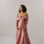 Triângulo Invertido: Excelente, o volume do laço e o decote tomara que caia equilibram a largura dos ombros, e a saia volumosa com fenda adiciona leveza à parte inferior.
