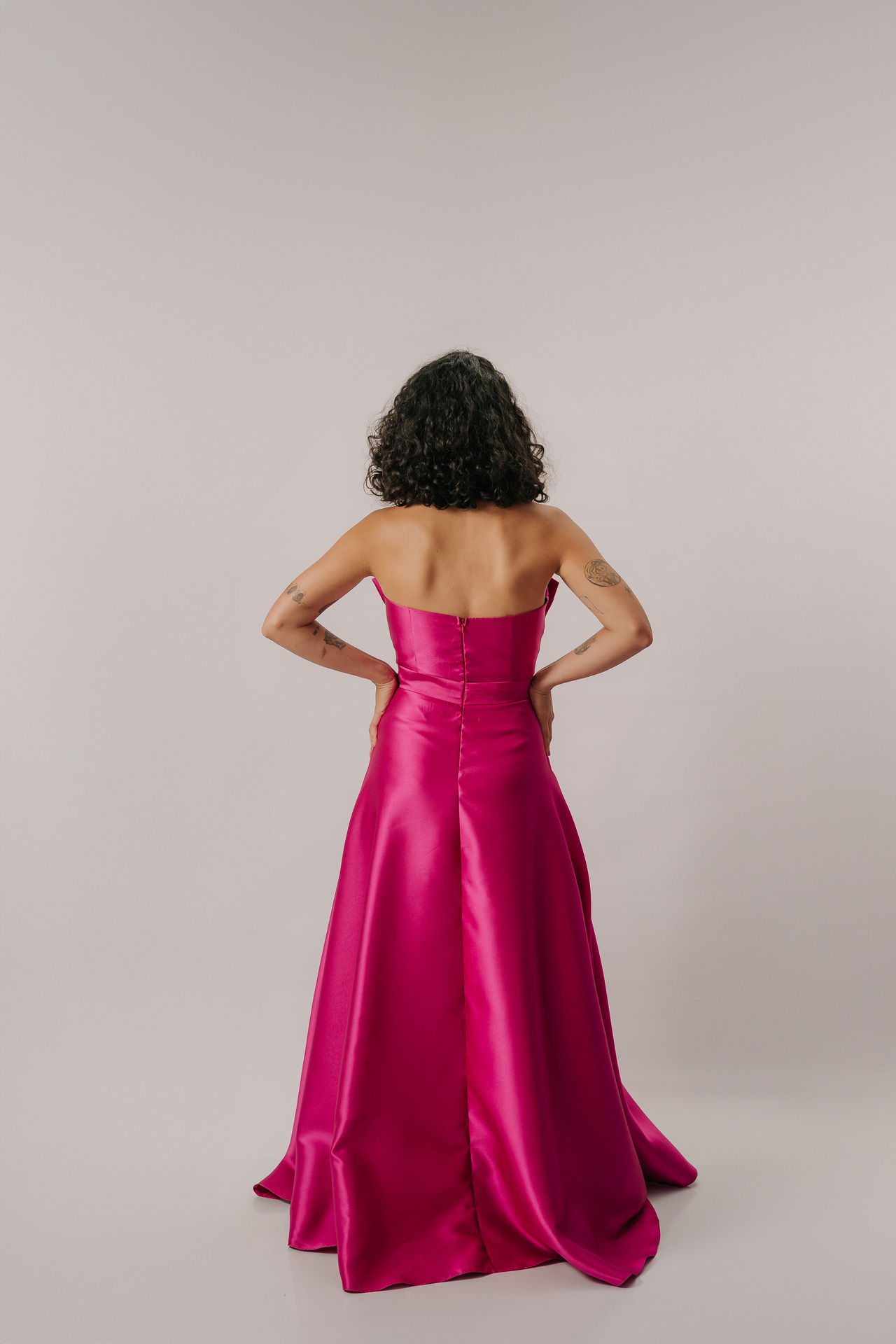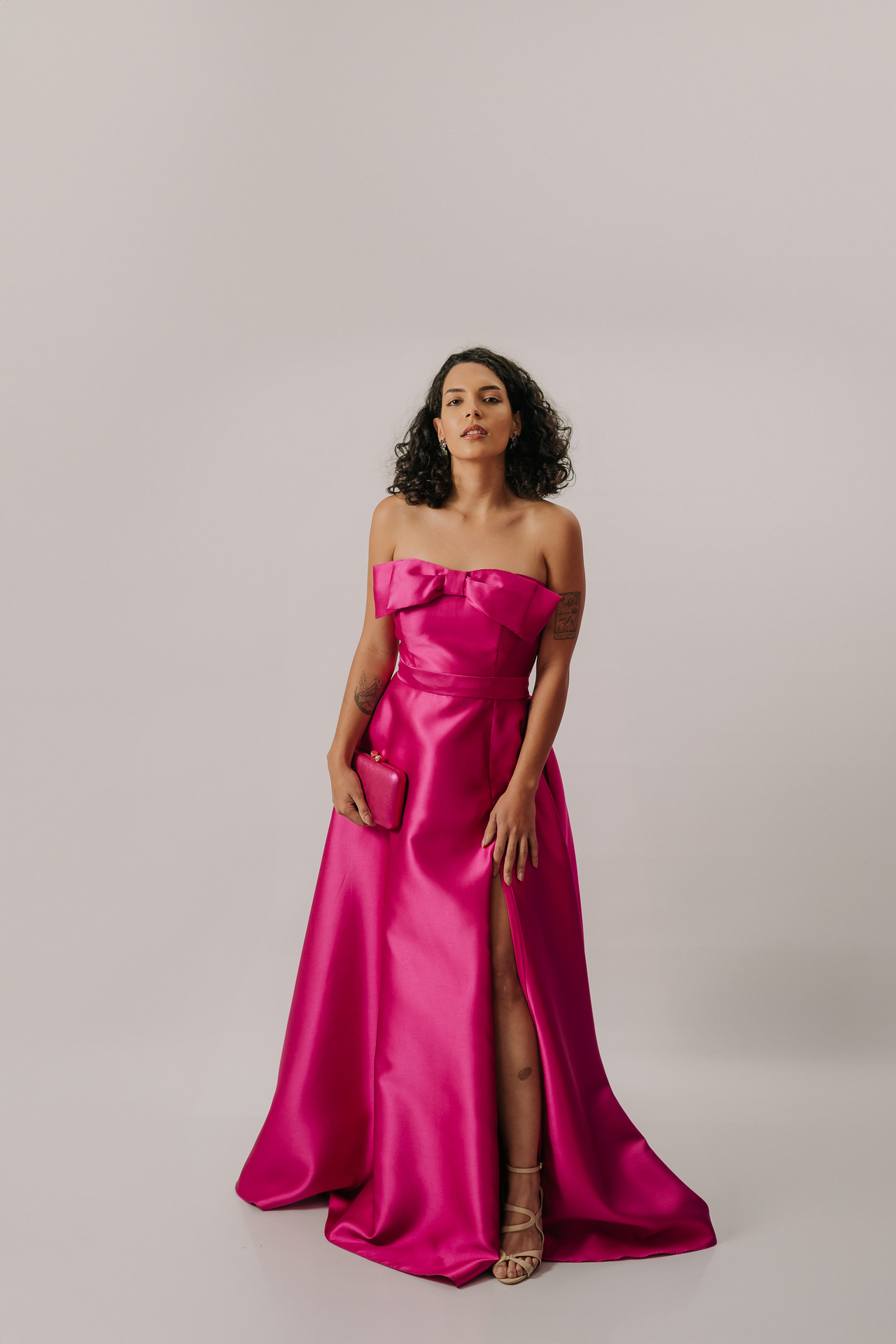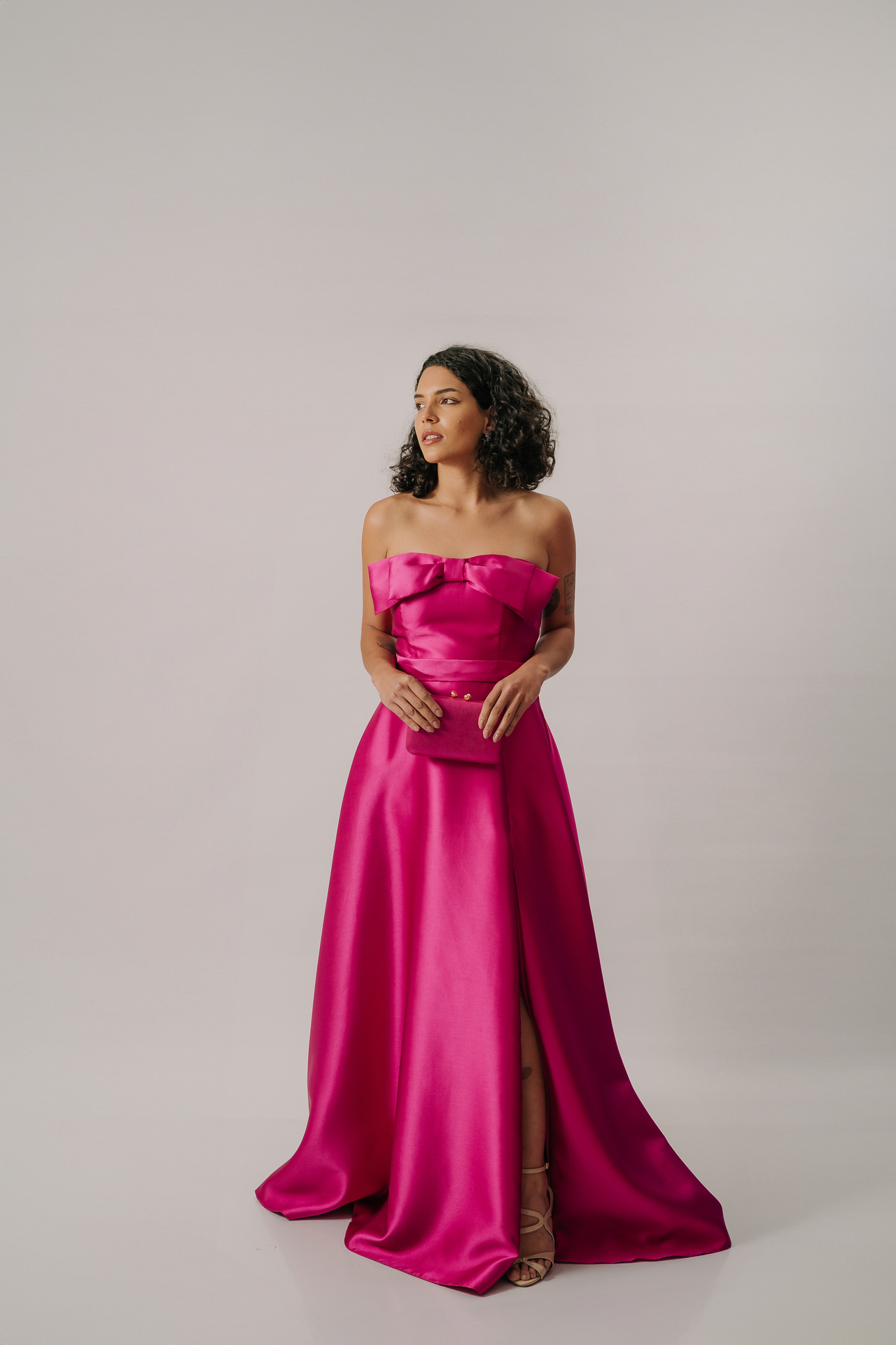 Vestido tomara que caia com laço frontal e saia de fenda – fúcsia