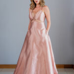 Vestido longo rosa com um ombro só e recorte lateral discreto