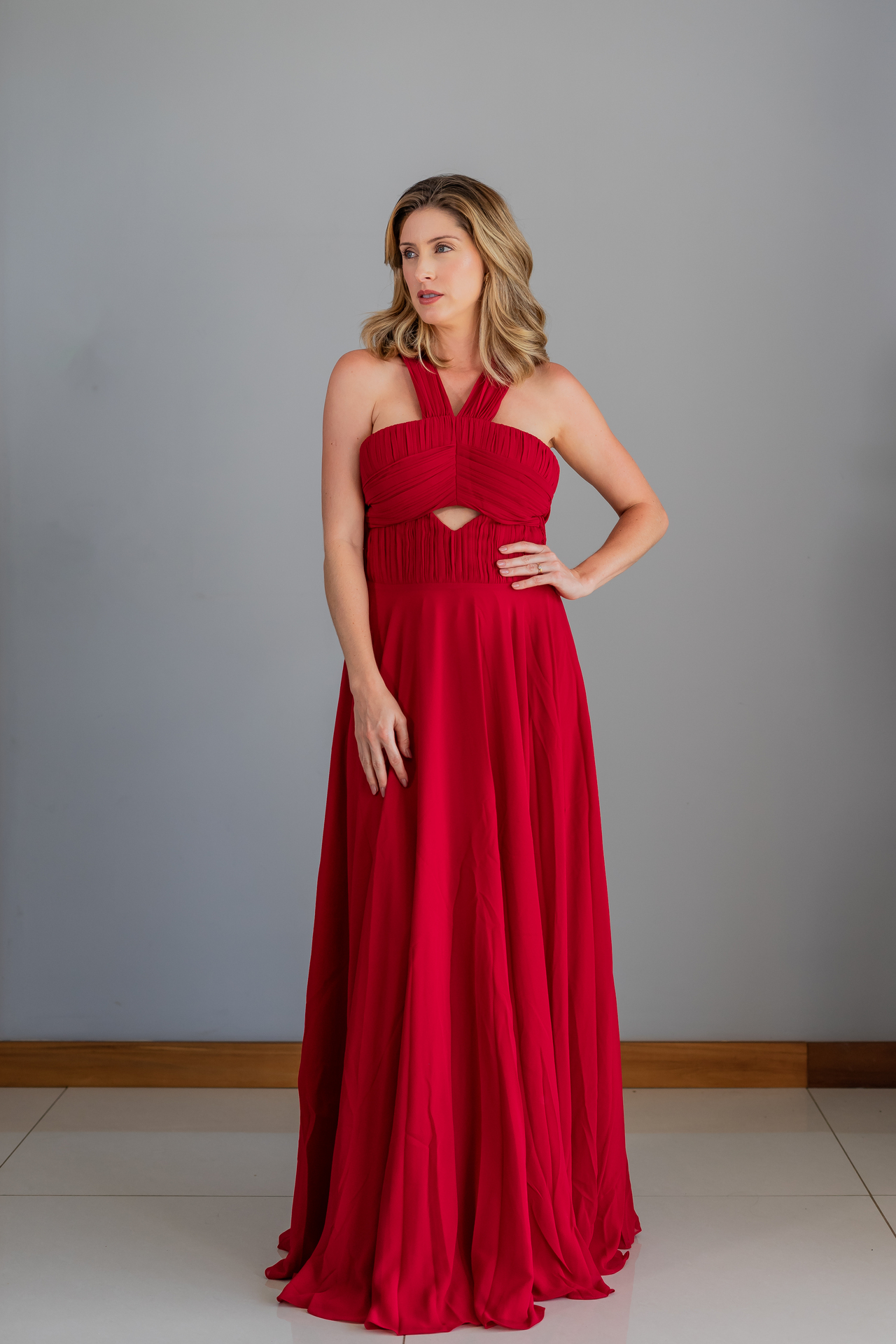 Vestido vermelho fluido com detalhe drapeado
